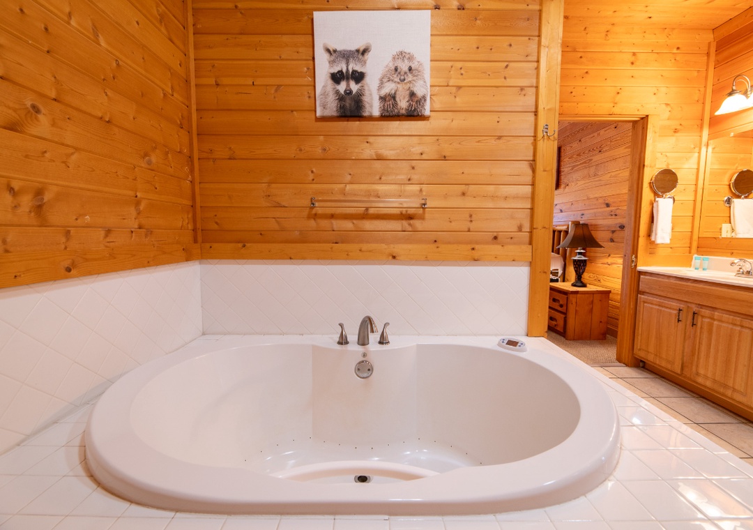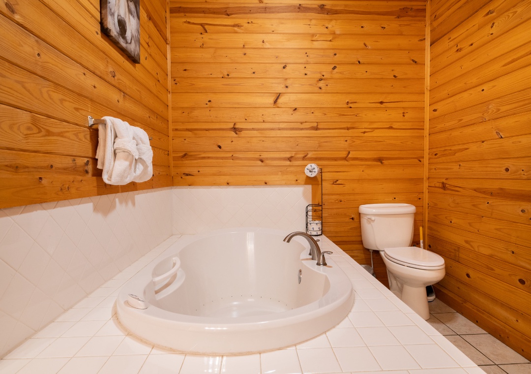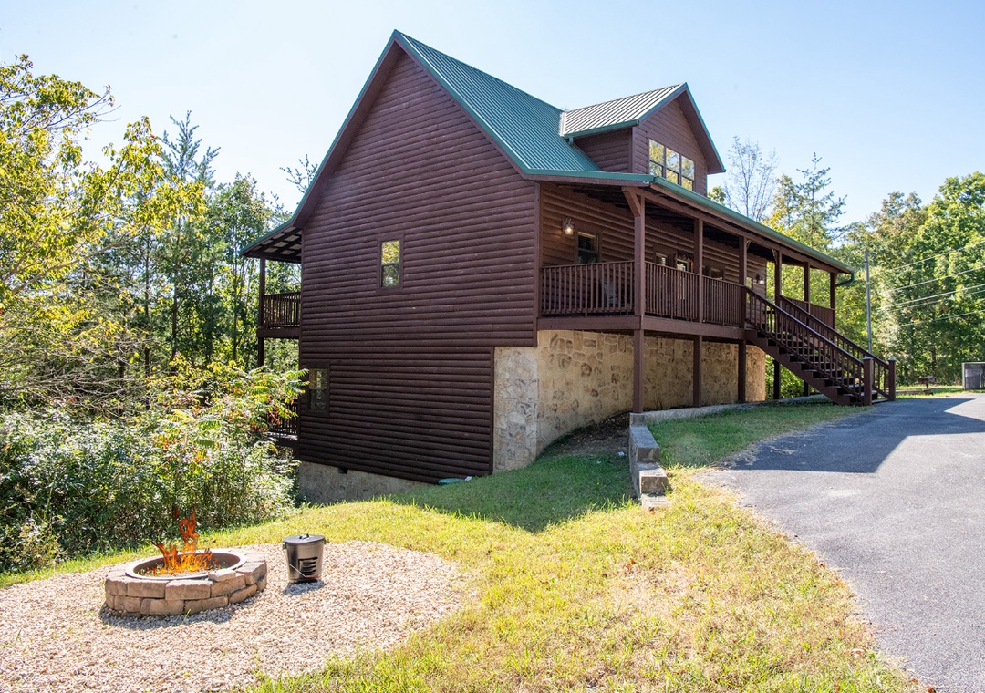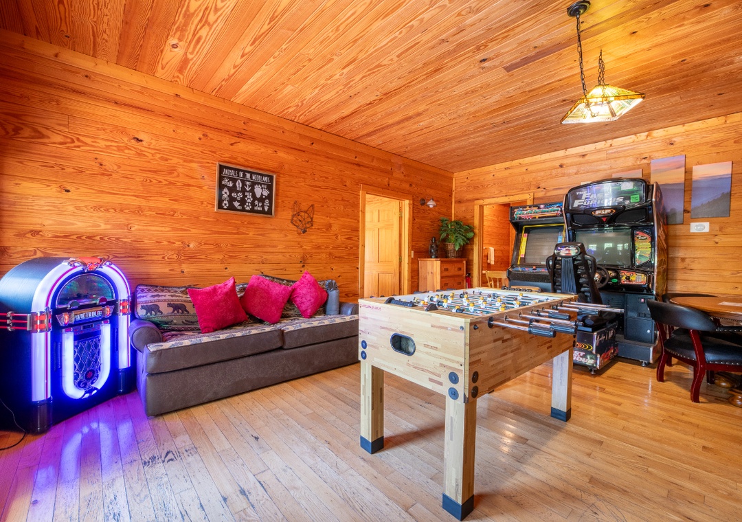 The heart of Nicoha's entertainment options is the expansive lower-level game room. Here, you'll find a classic jukebox that adds a nostalgic touch to your getaway, a foosball table for some competitive matches, a multicade arcade system with a variety of classic video games, and even a Fast and the Furious driving game for those looking to unleash their inner race car driver. Whether you're a fan of old-school arcade games or just looking for a little friendly competition, this game room is sure to be a hit with guests of all ages. After some action in the game room, you can unwind just outside on the lower deck, where a private hot tub awaits. Whether it's day or night, the hot tub provides a perfect space to relax and take in the beautiful wooded views, letting the warmth and bubbles soothe your muscles after a long day of play. For those who love spending time outdoors, Nicoha has plenty to offer as well. To the right of the front deck, you'll find a park-style grill, perfect for grilling up your favorite meals. You can enjoy your food on the spacious deck or gather around the wood firepit to the left of the deck, where you can roast marshmallows, share stories, and enjoy the mountain air. Whether you're challenging friends in the game room or relaxing in the hot tub, our cabin is designed to ensure your time in the Smoky Mountains is filled with fun and relaxation.