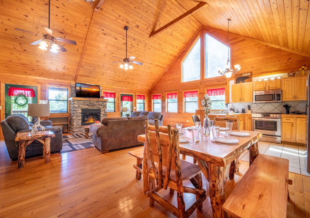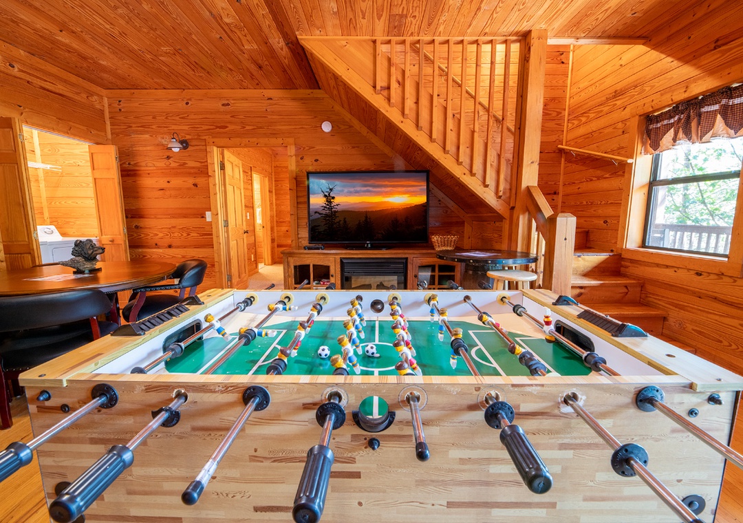 As soon as you enter, you'll find yourself in the heart of the cabin's open-concept living, dining, and kitchen areas. This expansive main floor is perfect for gatherings, with plenty of natural light streaming in through large windows that frame the surrounding forest views. The living room is centered around a cozy propane fireplace, offering the perfect spot to relax on cool evenings. Adjacent to the living area, you’ll find the fully-equipped kitchen that has everything you need to prepare a hearty breakfast before a day of adventure or a special dinner in the evening. Downstairs, the cabin’s second living area opens up into an entertainment paradise. The game room is packed with fun options, making it the perfect spot to spend a rainy afternoon or a laid-back evening. This lower-level living space also has its own electric fireplace, providing warmth and ambiance as you enjoy a casual game night or relax with friends and family. Free WiFi is also available throughout the property.