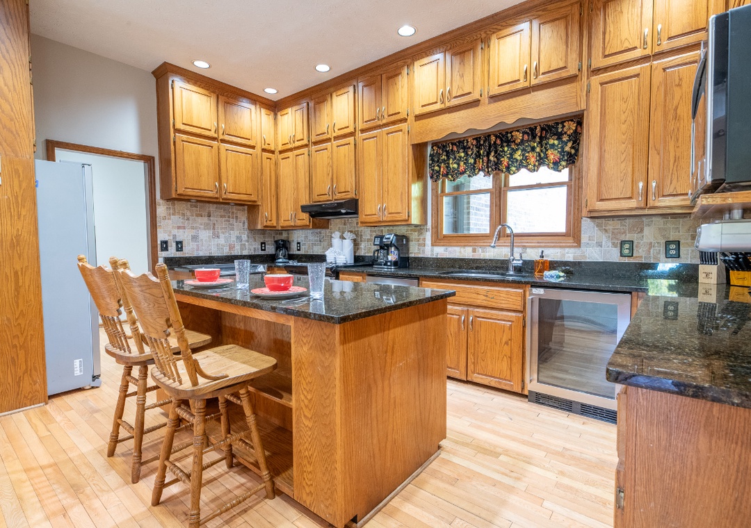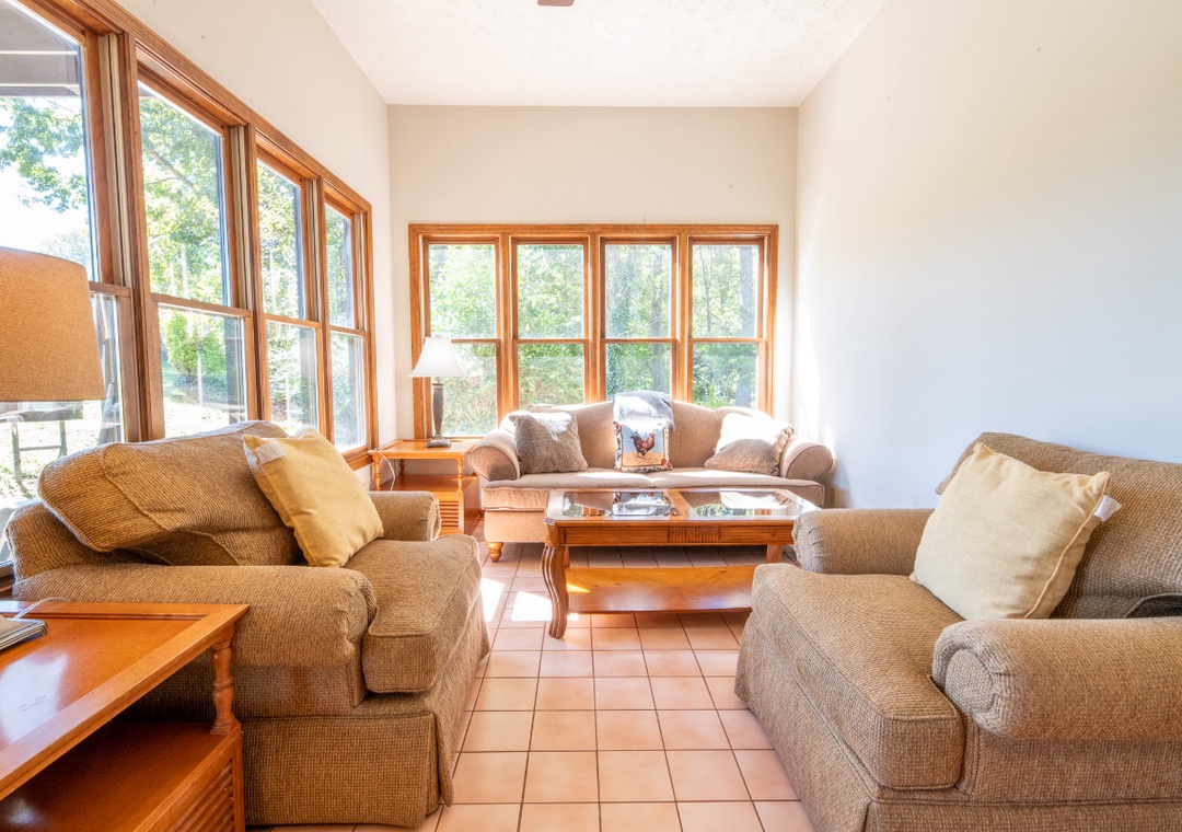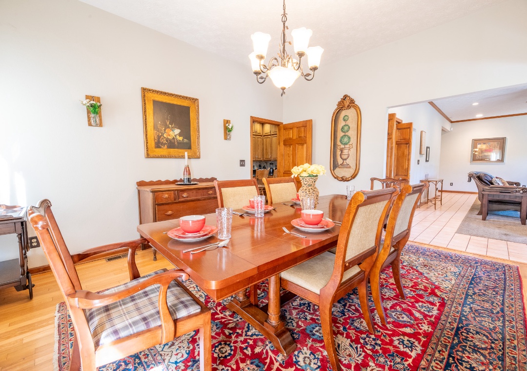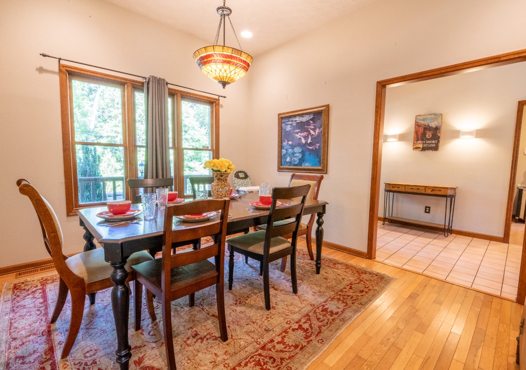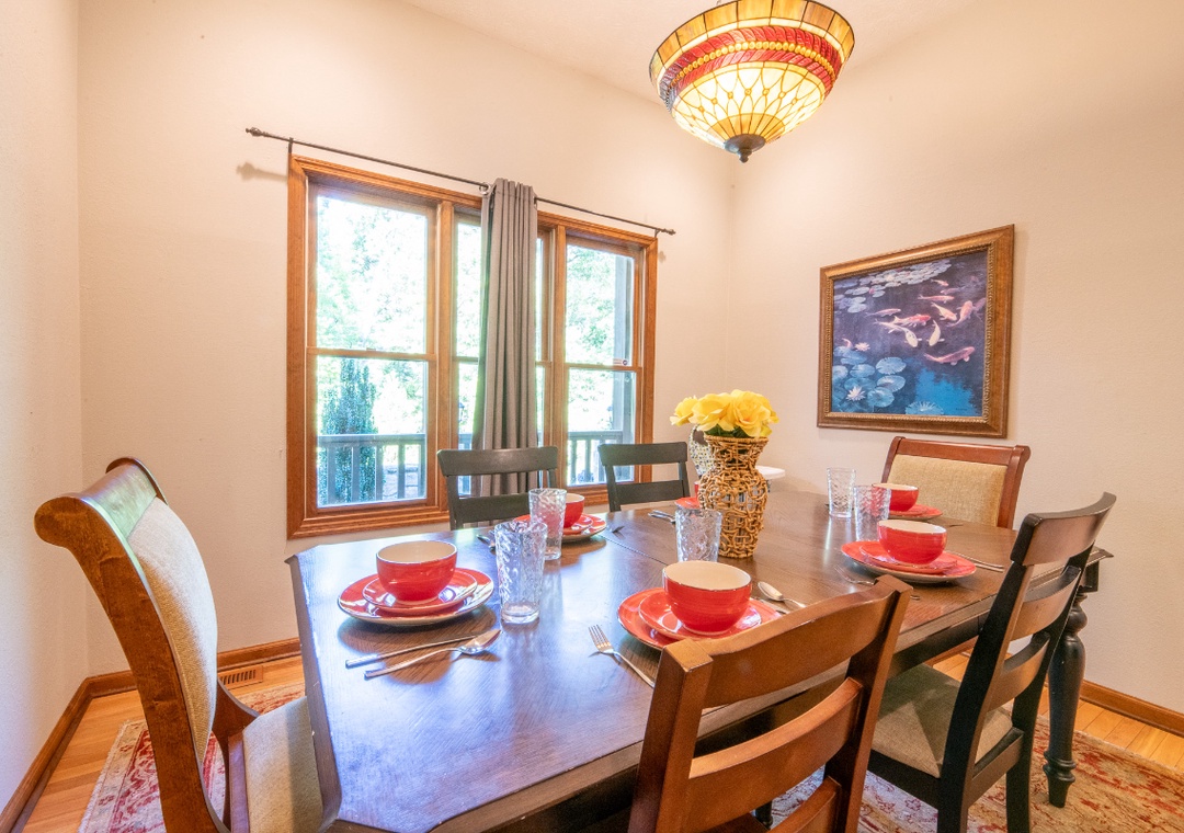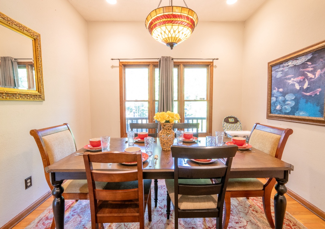The fully-equipped kitchen boasts modern amenities alongside traditional touches, making it easy to prepare delicious meals for your family or friends. Well-appointed with a full-sized refrigerator, dishwasher, stove, microwave, and other kitchen appliances perfect for making breakfast, lunch, or dinner throughout your stay! All pots, pans, glasses, plates, silverware, etc. are also there for you! Gather around the inviting dining table to share stories and laughter as it invites you to savor each bite while taking in the natural beauty of the surroundings.