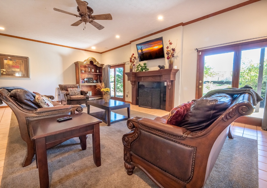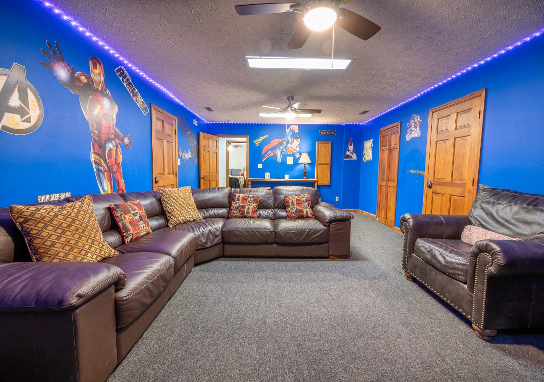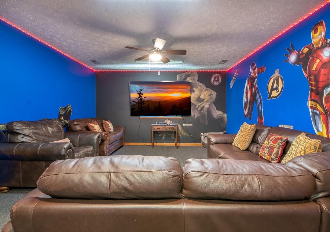 At the center of the living room is one of the two natural gas fireplaces, perfect for gathering around with friends and family on cool evenings. Comfortable seating is arranged to encourage relaxation and conversation, with ample room for everyone to enjoy the warmth of the fire. Also find the kitchen which is fully equipped with modern appliances, allowing for easy meal preparation whether you're cooking for a few or a crowd. A standout feature is the theater room, where the 75" Sony Smart TV transforms movie nights into an immersive cinematic experience. For those looking for a bit more excitement, the game room at Peachtree is a hub of activity and fun and it’s packed with options to keep everyone entertained. Free WiFi is also available throughout the property. With so much to do indoors, even rainy days feel like an adventure at Peachtree.