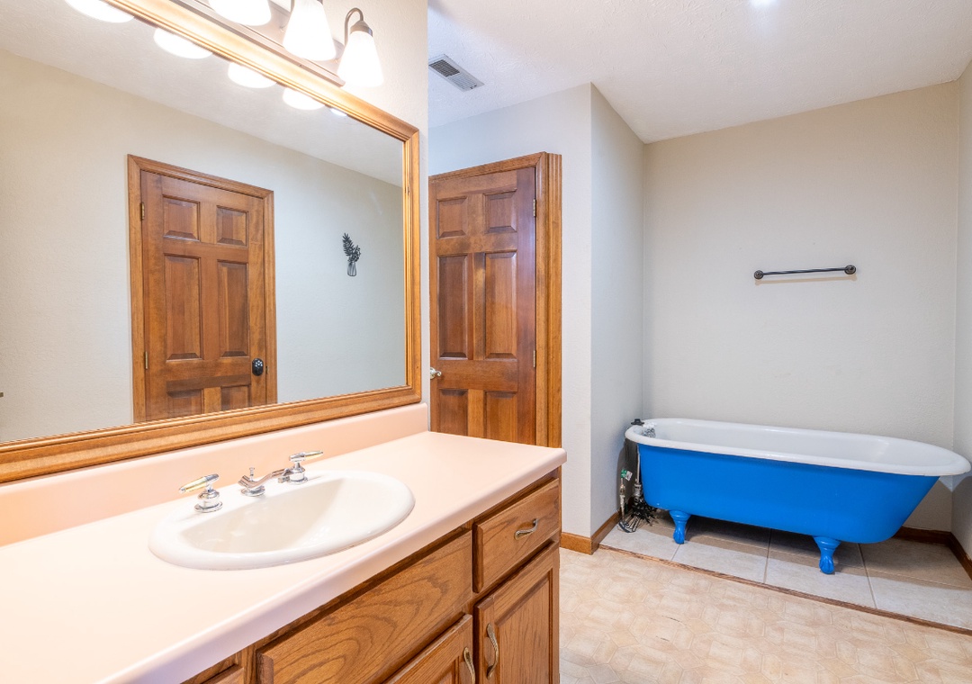 ✔ Bedroom #3 (Upper Level): Relaxing Bedroom with a King-size Bed and a Flat-screen TV; Access to a Full Bathroom with Stand-up Shower and Claw Foot Tub