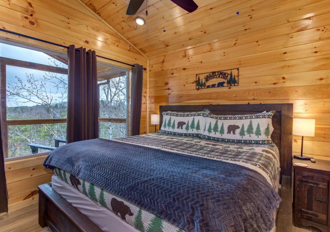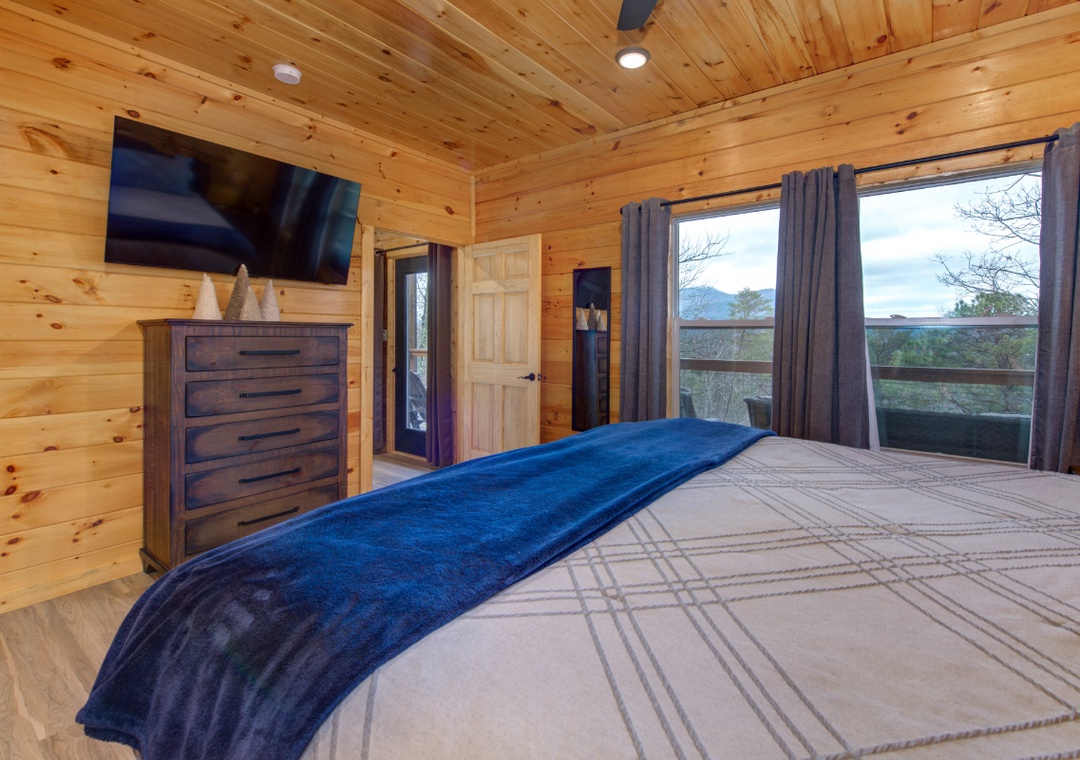 ✔ Bedroom #2 (Upper Level): Spacious Bedroom with a King-Bed and Flatscreen TV; Attached Full Bathroom with Shower/Tub Combo