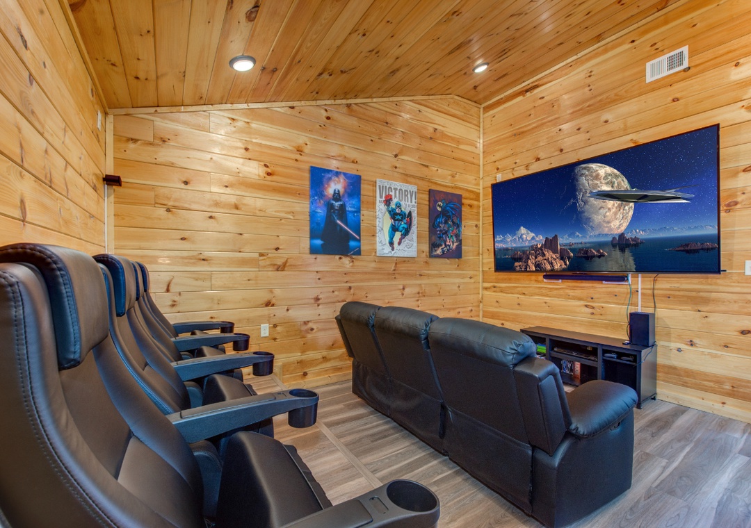Indoor comfort defines Pine Haven Cabin, beginning with the large family room where a big-screen TV and plush seating invite you to settle in. The private home theater elevates movie night with a massive 75” TV and an XBOX gaming system, perfect for both families and gamers. Downstairs, the year-round heated indoor saltwater pool offers a unique luxury you can enjoy in any season. Free WiFi is also available throughout the property, ensuring that streaming, remote work, or keeping the kids entertained is effortless.