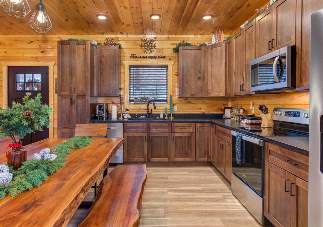 The fully-equipped kitchen is as functional as it is inviting. Well-appointed with a full-sized refrigerator, dishwasher, stove, microwave, and other kitchen appliances perfect for making breakfast, lunch, or dinner throughout your stay! All pots, pans, glasses, plates, silverware, etc., are also there for you! Gather around the inviting dining table inside, or take your meal out to the picnic table to share stories and laughter beneath the trees, each bite made even better by the fresh mountain air and the natural beauty all around.