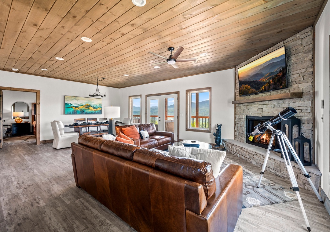 The living room is the centerpiece of the cabin, featuring a warm and inviting gas fireplace that becomes the perfect gathering spot on cool mountain evenings. The room is bathed in natural light, thanks to the expansive windows that offer breathtaking views of the Smoky Mountains, creating a serene backdrop for your stay. Adjacent to the living area, the open-concept kitchen and dining space are designed for both functionality and style. The fully equipped kitchen allows you to prepare delicious meals with ease, while the dining area is perfect for family dinners or intimate gatherings. For those seeking entertainment, the cabin does not disappoint. The dedicated game room features a Pool Table, Multicade gaming system, and Golf Arcade, providing endless hours of fun and competition for guests of all ages. Free WiFi is also available throughout the property.