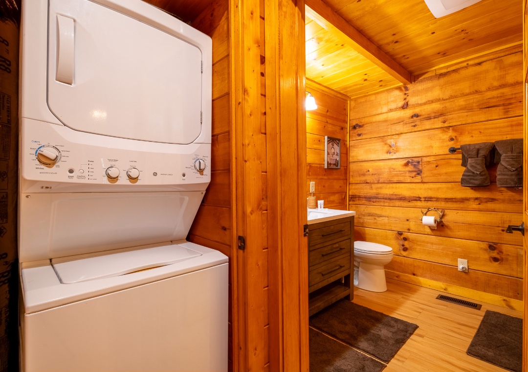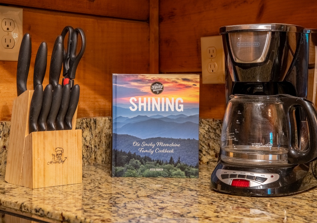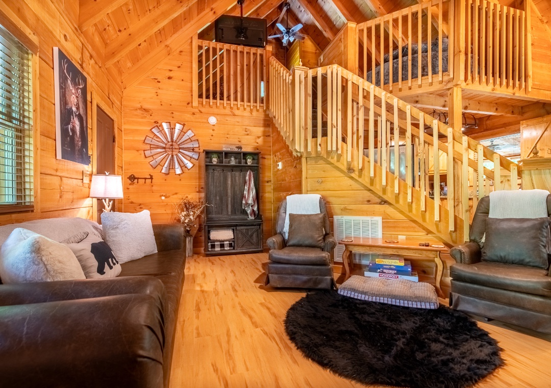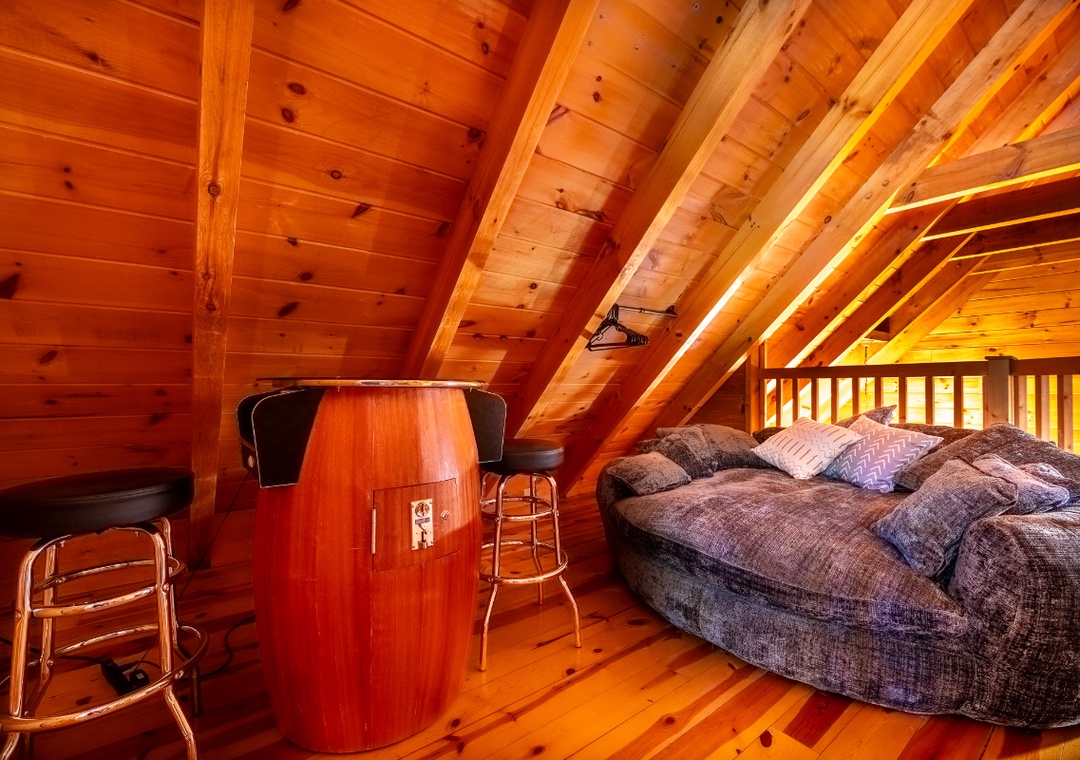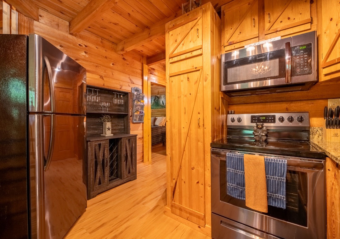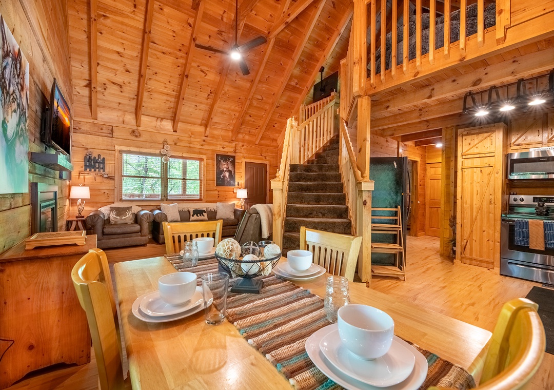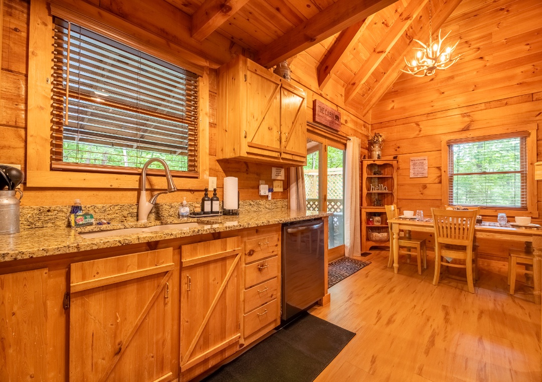 The open-concept living area is centered around an electric fireplace, perfect for setting a cozy mood in any season. Whether you’re curling up with a book, sipping hot cocoa after a hike, or enjoying a quiet evening indoors, the glow of the fireplace creates the perfect atmosphere to relax and unwind. The living room also features plush sofas and a seating area arranged around a 50" TCL Roku TV, making it easy to stream your favorite shows and movies with just a few clicks. Just off the living room, the kitchen is beautifully appointed with granite countertops and natural wood cabinetry, creating a warm and functional space for meal prep. The cabin also includes a multicade arcade machine upstairs, offering a touch of retro fun with dozens of classic games. Free WiFi is also available throughout the property.