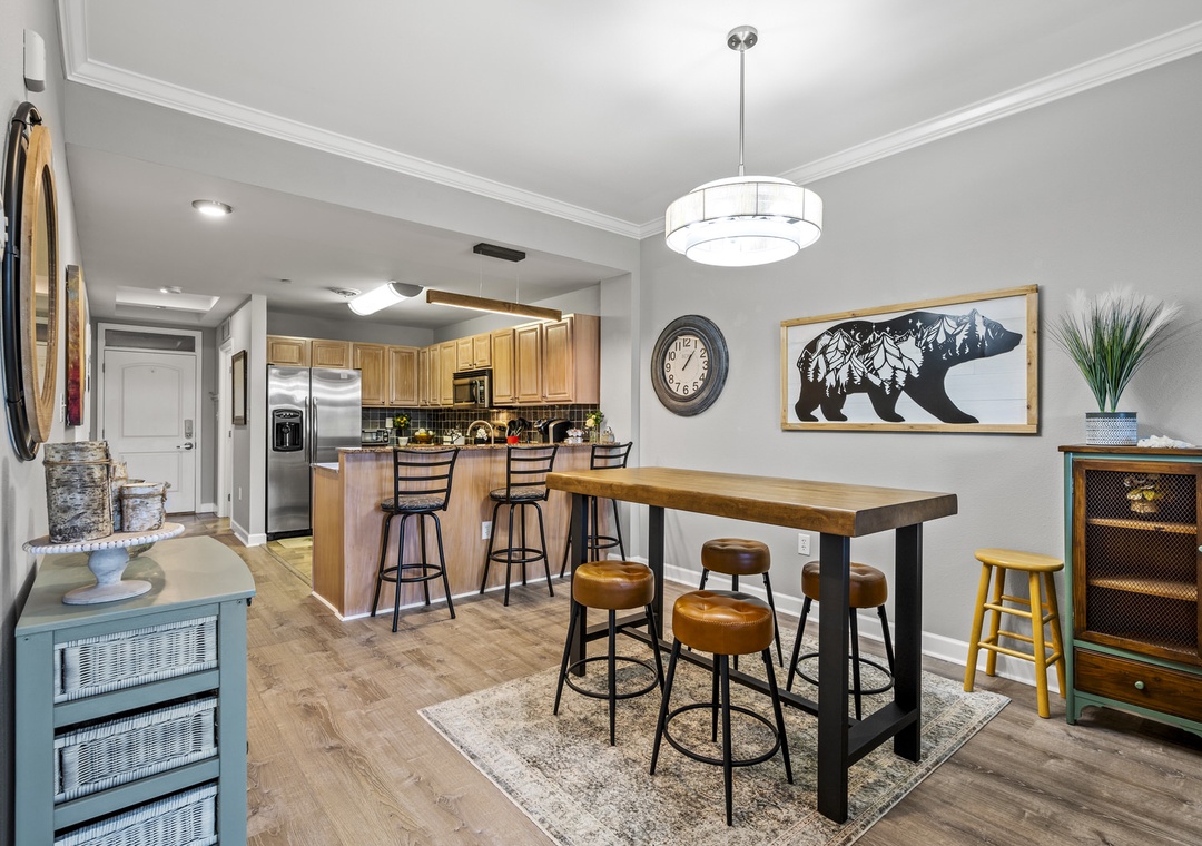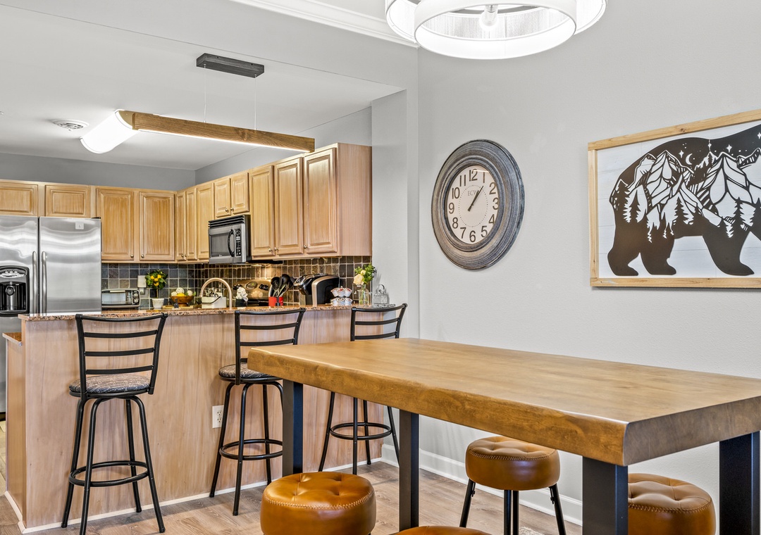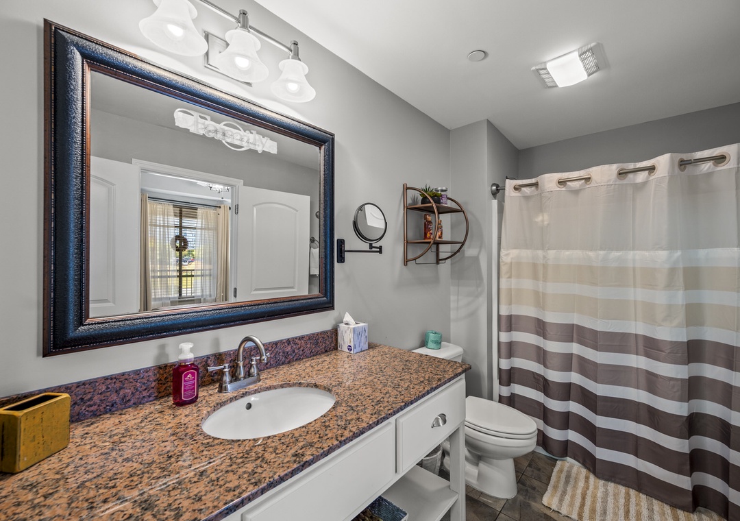 The spacious kitchen is fully equipped with a full-sized refrigerator, dishwasher, stove, microwave, and other kitchen appliances perfect for making breakfast, lunch, or dinner throughout your stay! All pots, pans, glasses, plates, silverware, etc. are also there for you! Gather around the dining table or dine at the breakfast bar, while enjoying your culinary delights!