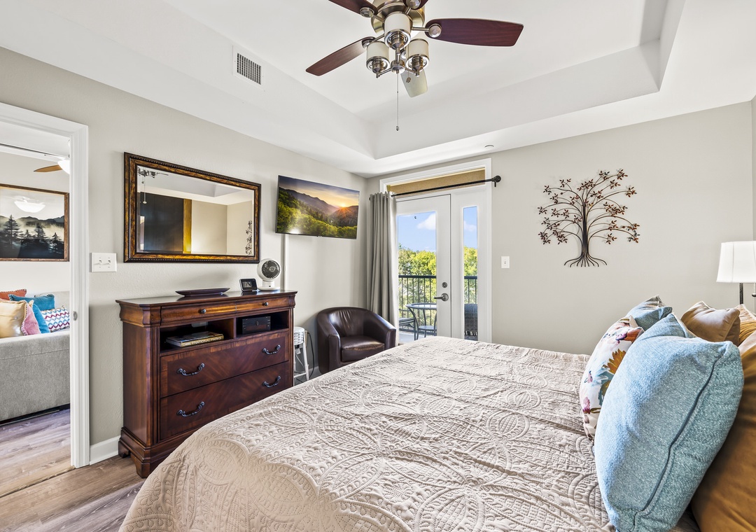 ✔ Bedroom #1: Spacious bedroom with a King-sized bed, dresser, flat-screen TV and access to the patio; Attached full bathroom with dual vanities, jacuzzi bathtub and separate shower.