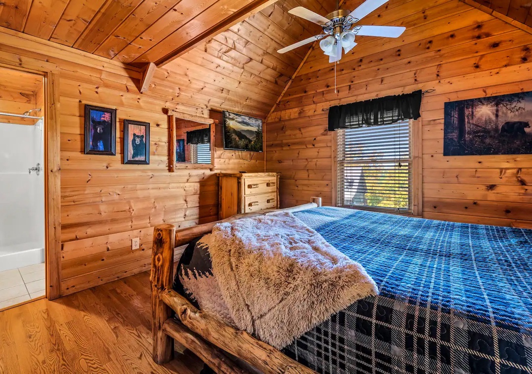 Bedroom #3 (upstairs): King suite with private full bath, futon sitting and sleeping area, fireplace and TV