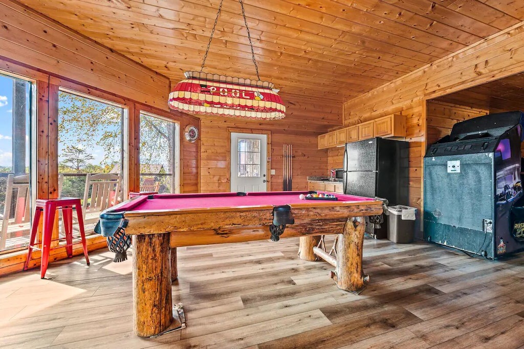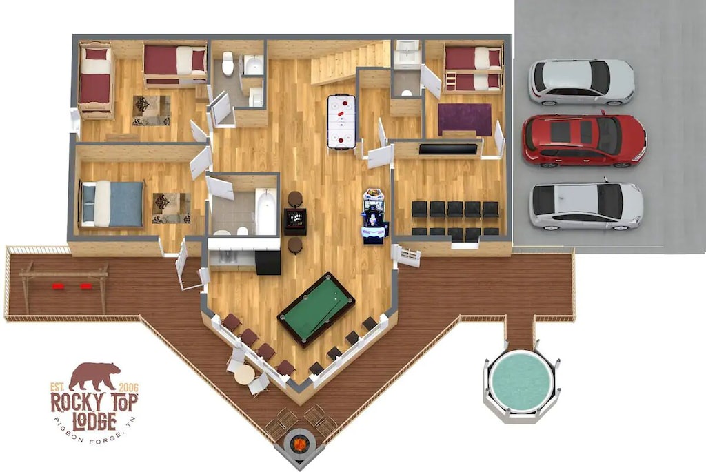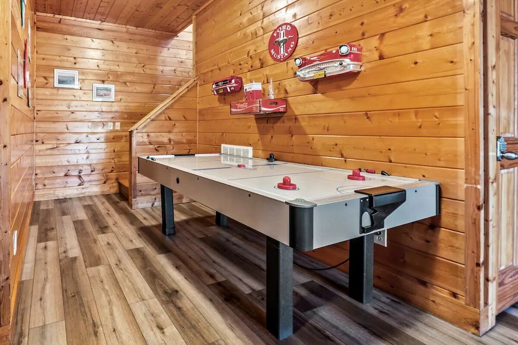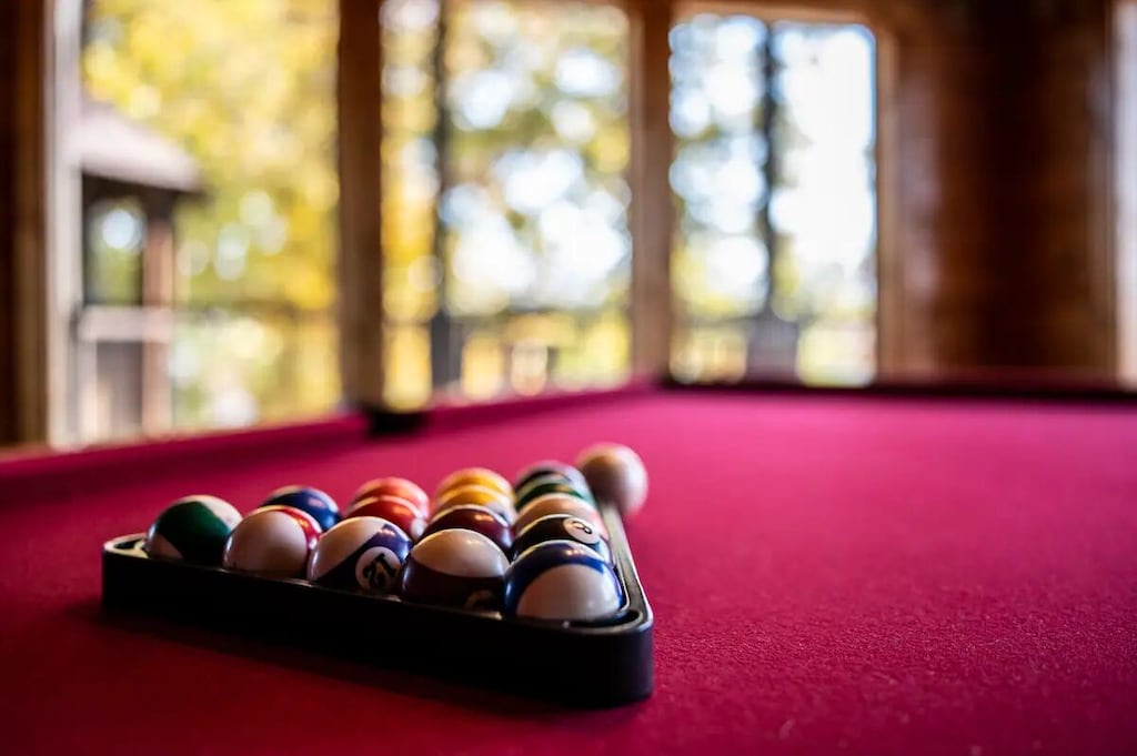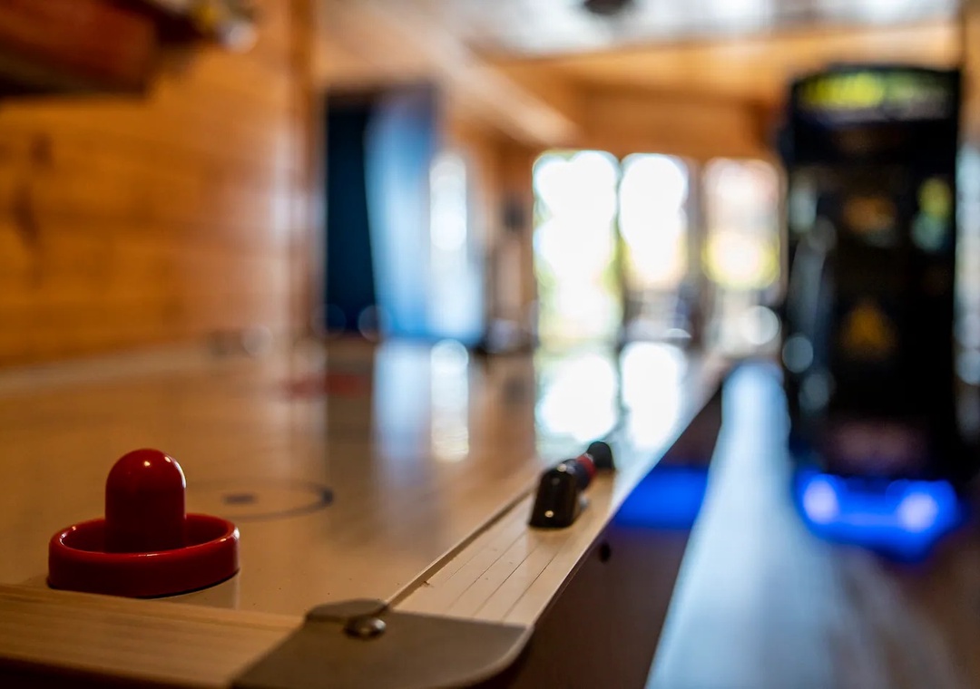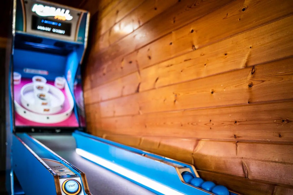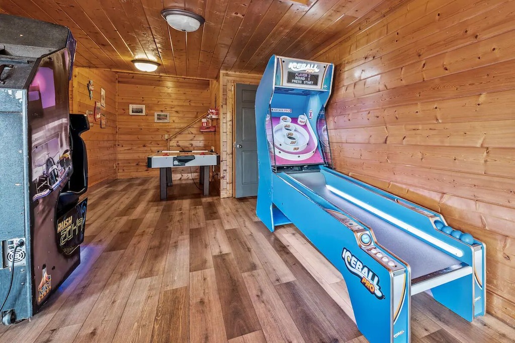 - Game room with pool table, skeeball, air hockey, and more