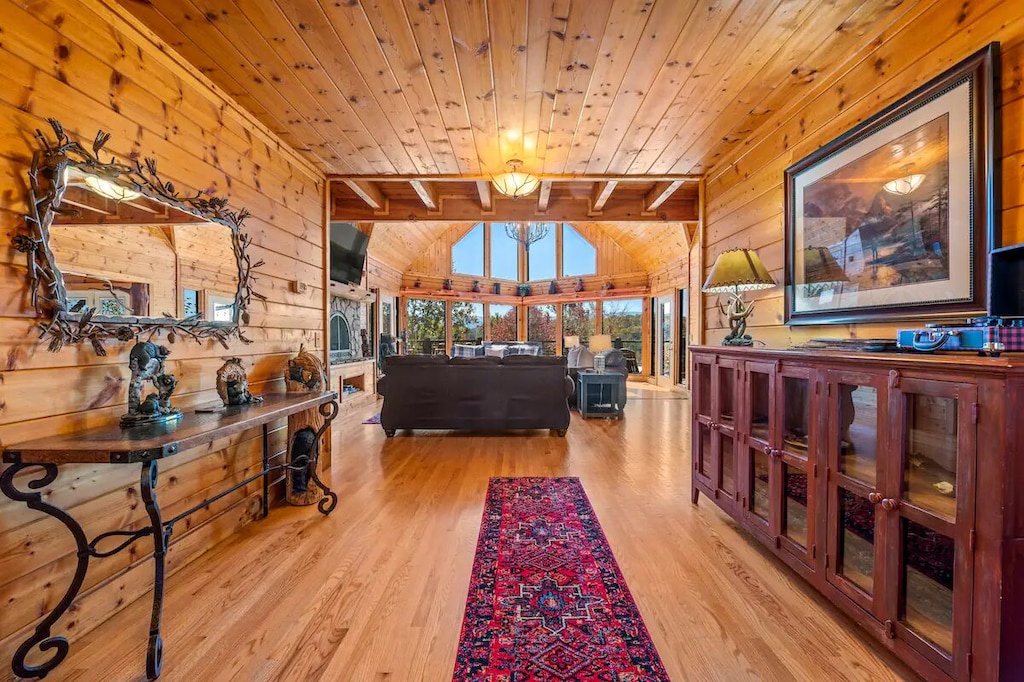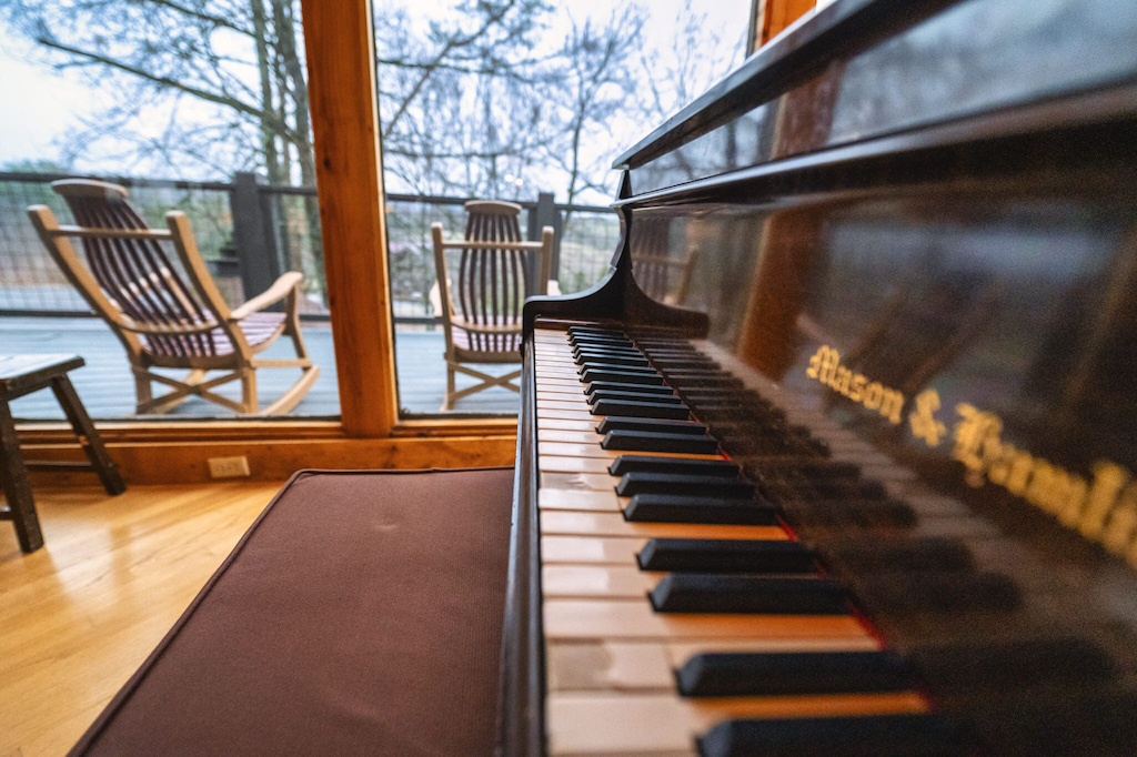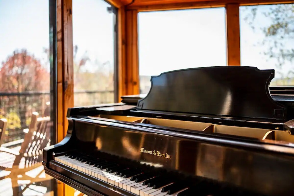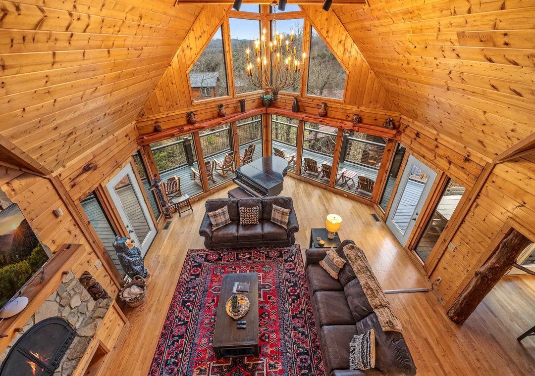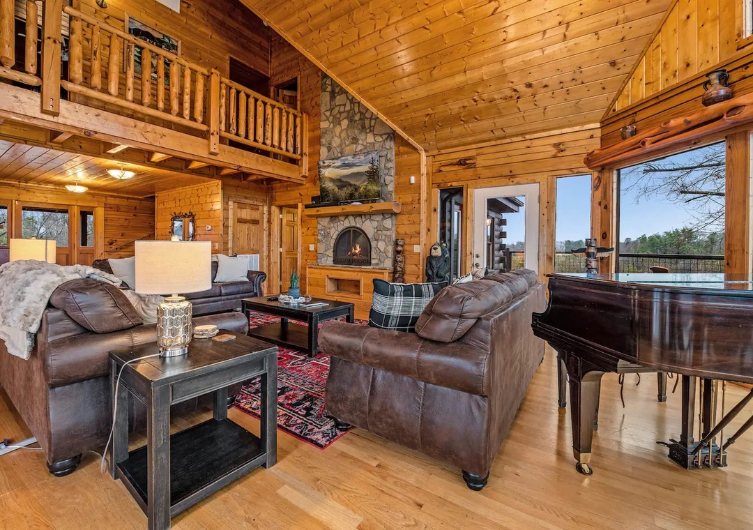 The cabin itself is appointed just as you'd hope and is both massive in size AND filled with charm. As you walk into the front door, you're greeted by soaring 20' ceilings. A gas fireplace in the large living room lets everyone feel warm and cozy on a chilly night, and a baby grand piano is right there in case anyone is feeling inspired to play. The kitchen has just about everything you need for your stay -- a Keurig and a coffee maker, pots, pans, silverware, glasses, a blender, crock pot, microwave, iron and board, washer and dryer, and more. Just bring any food you want, store it in the pantry or one of the two refrigerators, and you're all set.