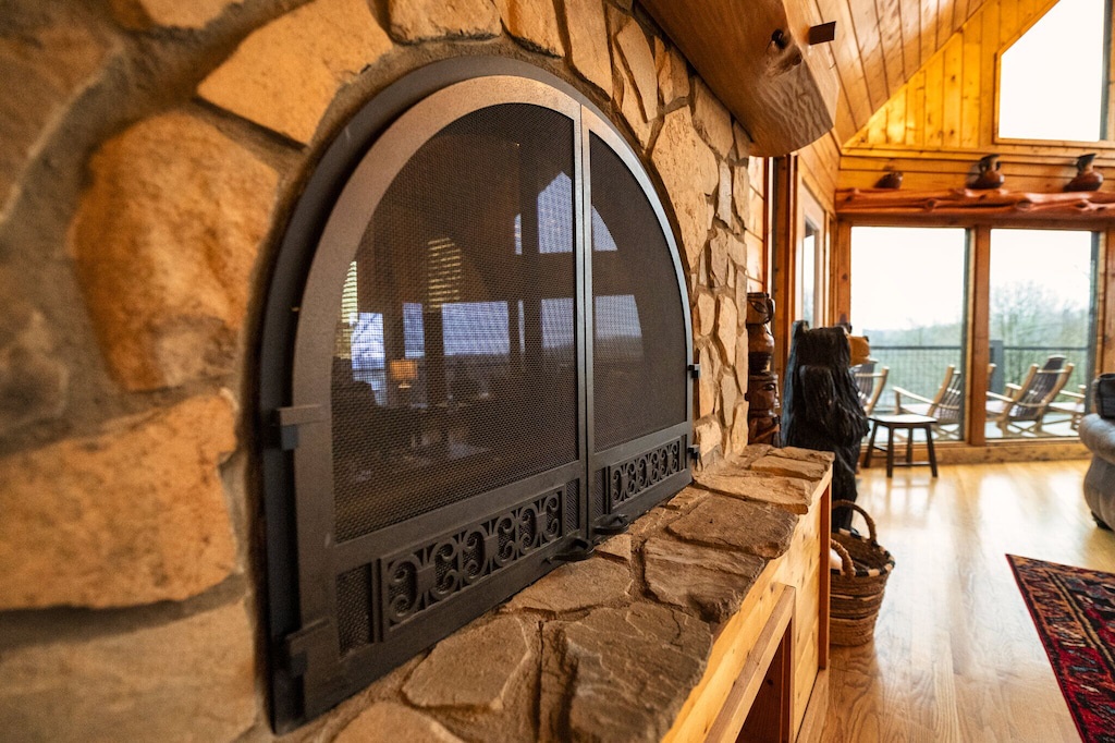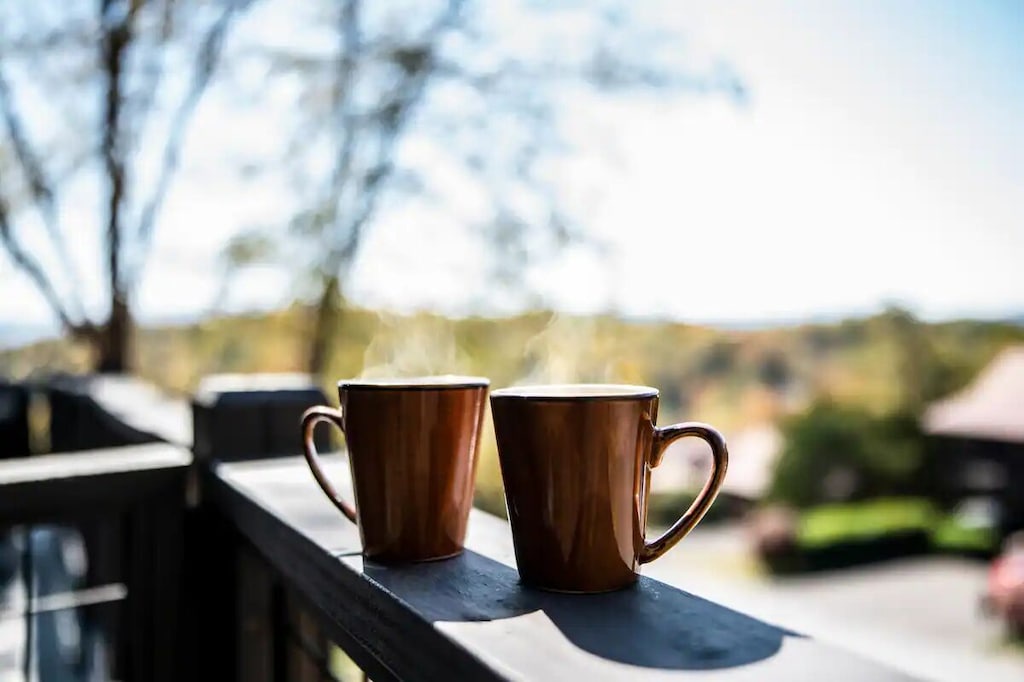 Located at the very top of a hill, the wraparound porch allows you to take in majestic views from all directions. Watching the sun rise over the hills and trees in the East with a cup of coffee has never been so relaxing. And as night falls, share some laughs in the private 6-person hot tub as the sun sets in the West.
