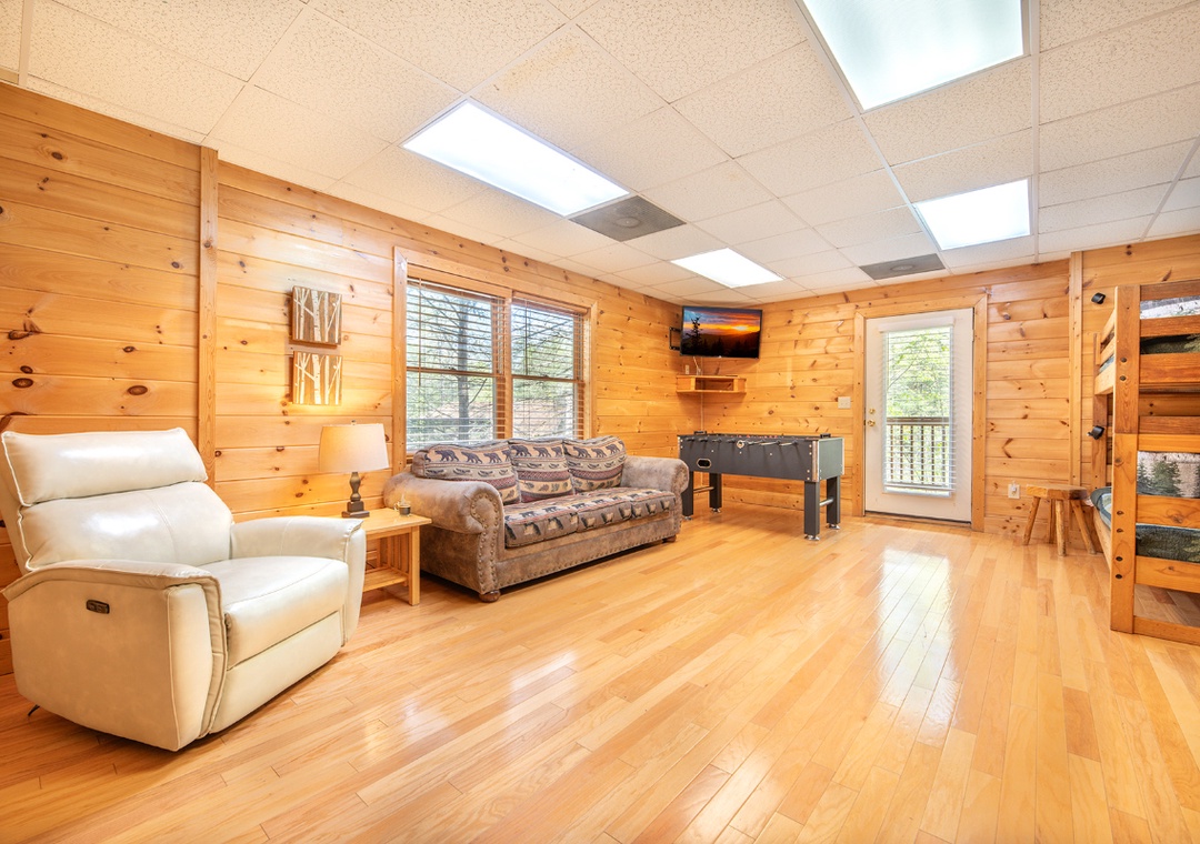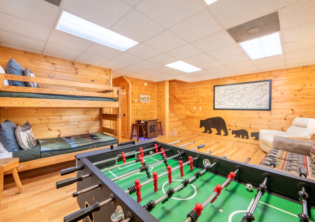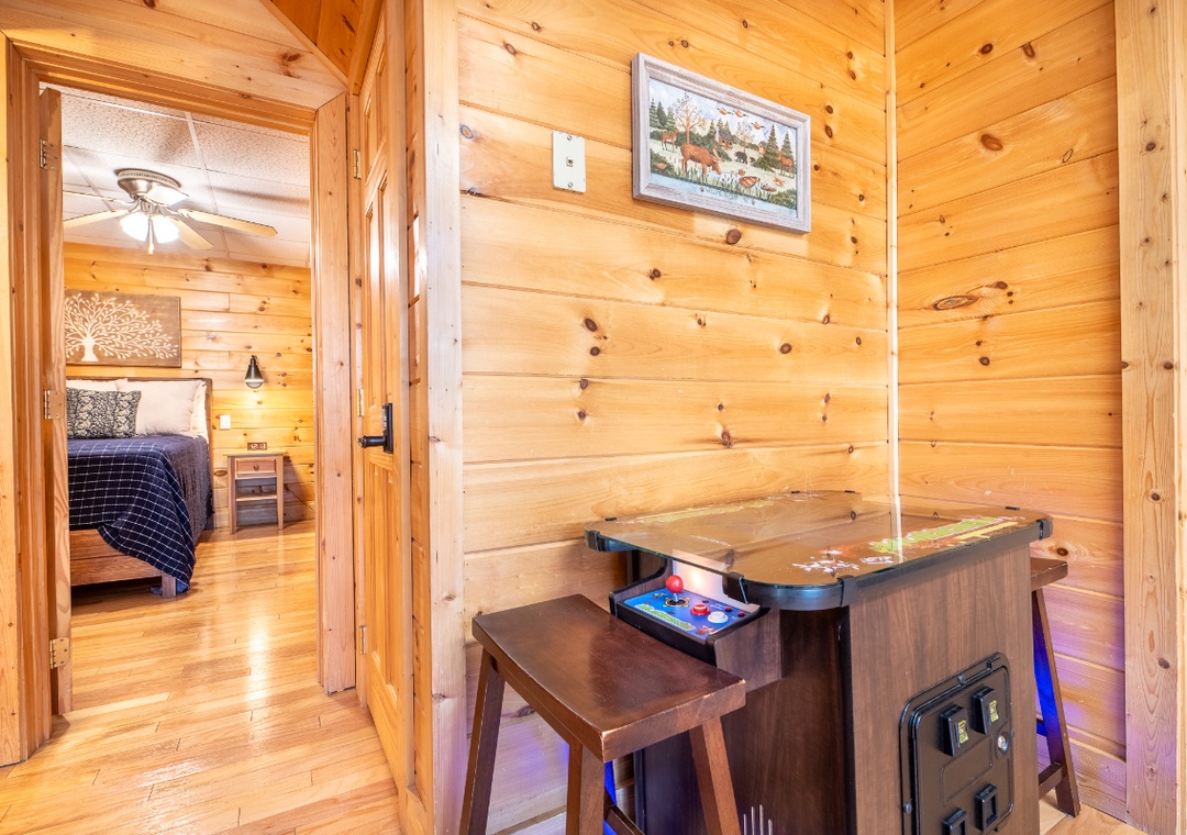 Downstairs, the game room is the true highlight of the cabin. It’s the ultimate hangout spot for both kids and adults, packed with everything you need to keep the fun going no matter the weather. Dive into some friendly competition with a round of foosball, or tap into your nostalgic side with the multicade arcade machine. There's also a 43" TCL Roku TV in the game room, perfect for streaming shows, watching sports, or hooking up your gaming console. Upstairs in the cozy living room, entertainment continues with a gas fireplace, a flat-screen TV, and comfy seating perfect for movie nights or quiet evenings. And when you're ready to take the fun outside, step out onto the main level back deck where you’ll find even more ways to enjoy your stay. A bubbling hot tub is ready and waiting to melt your stress away while you take in the surrounding wooded views. The propane grill is also located on this deck, so you can fire up some burgers, steaks, or veggies and enjoy a cookout in the fresh mountain air. The outdoor fun doesn’t stop there—a small downstairs patio offers even more space to relax. Whether you're sipping your morning coffee, catching up on a good book, or just taking in the quiet natural setting, you'll have plenty of room to breathe and unwind. And let’s not forget the unbeatable location. Just a short drive from the Parkway in Pigeon Forge, you’re never far from top-tier attractions and a huge variety of shops and restaurants.
