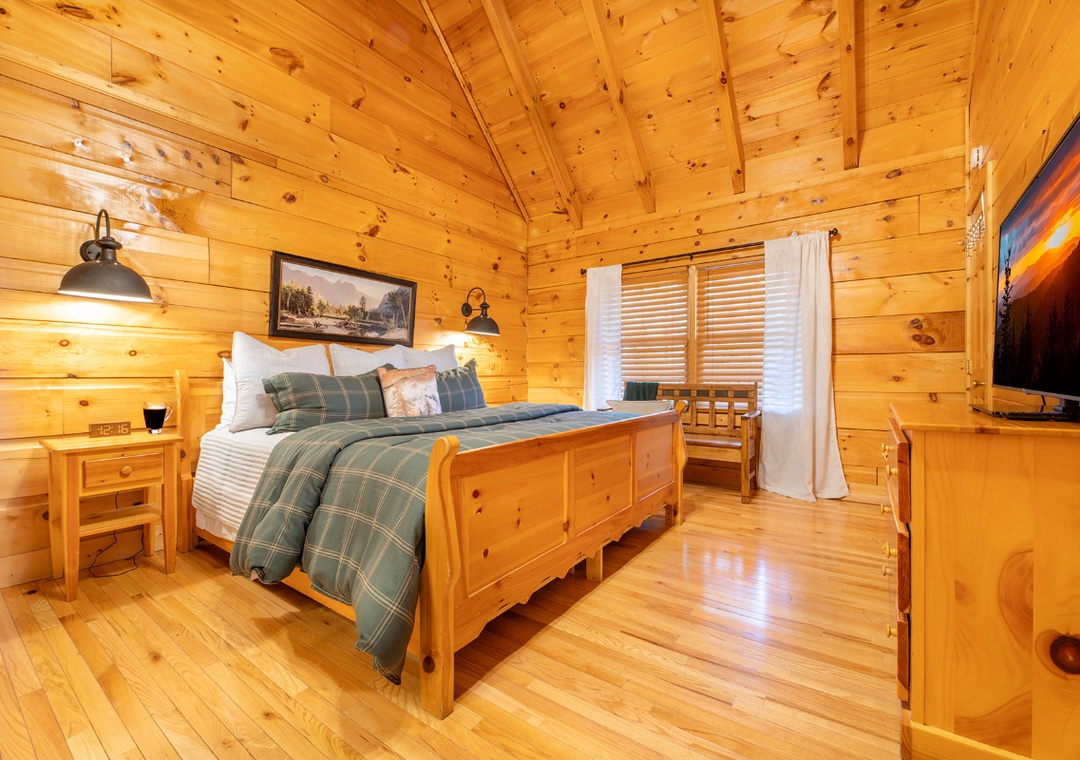 ✔ Bedroom #1 (Main Level): Relaxing Bedroom with a King Bed and Flat-screen TV; Attached Full Bathroom with Shower/Tub Combo and Separate Jacuzzi