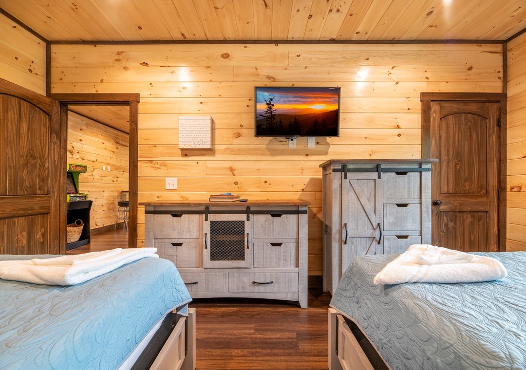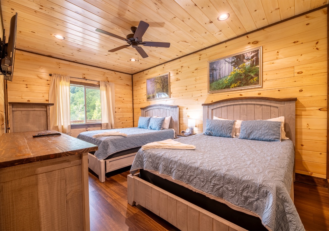 ✔ Bedroom #3 (Lower Level): Inviting Bedroom with 2 Queen-size Beds, Flat-screen TV, and Access to a Full Bathroom with Shower/Tub Combo