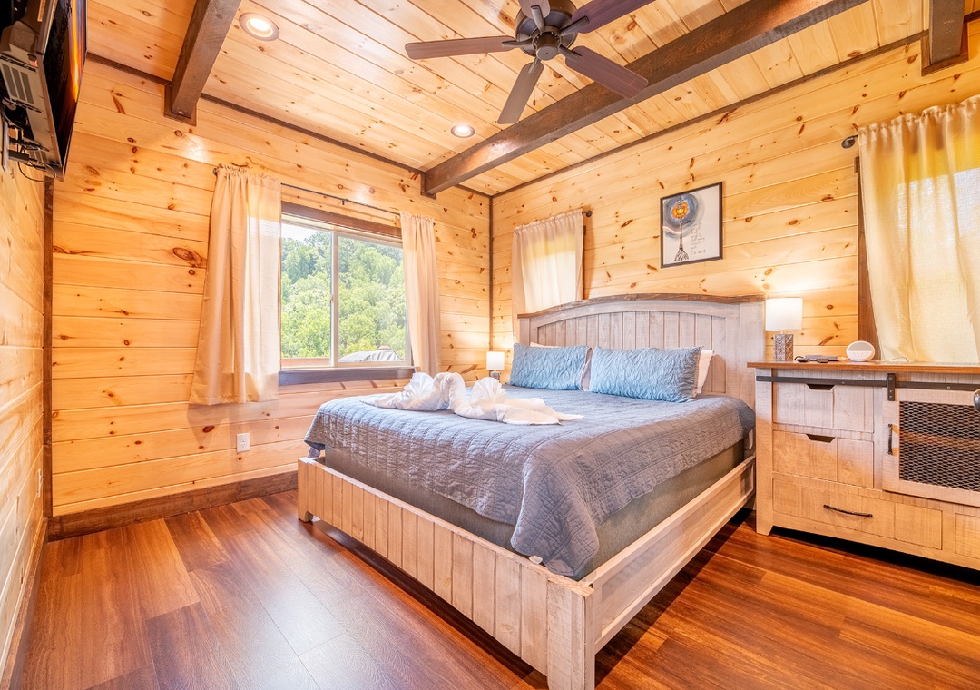 ✔ Bedroom #1 (Main Level): Spacious Bedroom with a King-size Bed, Flat-screen TV, and Attached Full Bathroom with Stand Up Shower