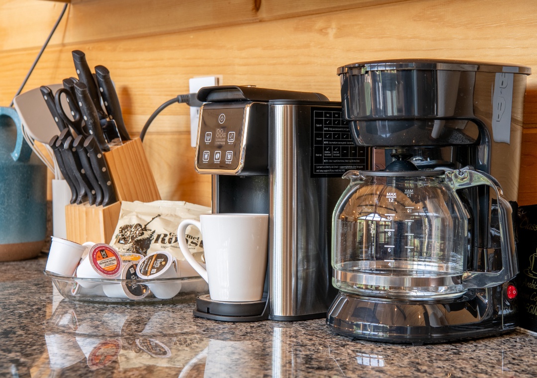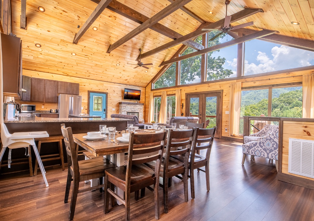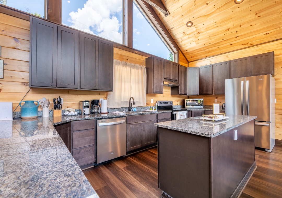 The fully-equipped kitchen boasts modern amenities, making it easy to prepare delicious meals for your family or friends. Well-appointed with a full-sized refrigerator, dishwasher, stove, microwave, and other kitchen appliances perfect for making breakfast, lunch, or dinner throughout your stay! All pots, pans, glasses, plates, silverware, etc., are also there for you! Gather around the inviting dining table or the nearby breakfast bar to share stories and laughter, as it invites you to savor each bite while taking in the natural beauty of the surroundings.