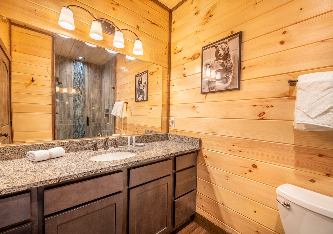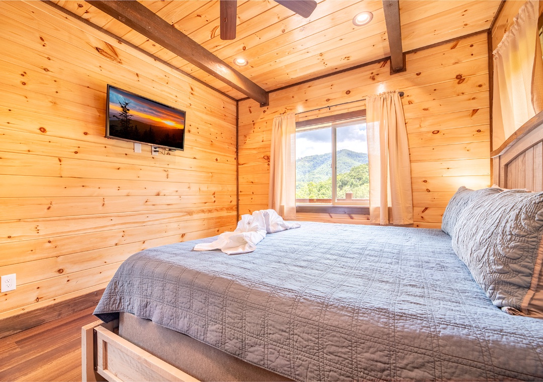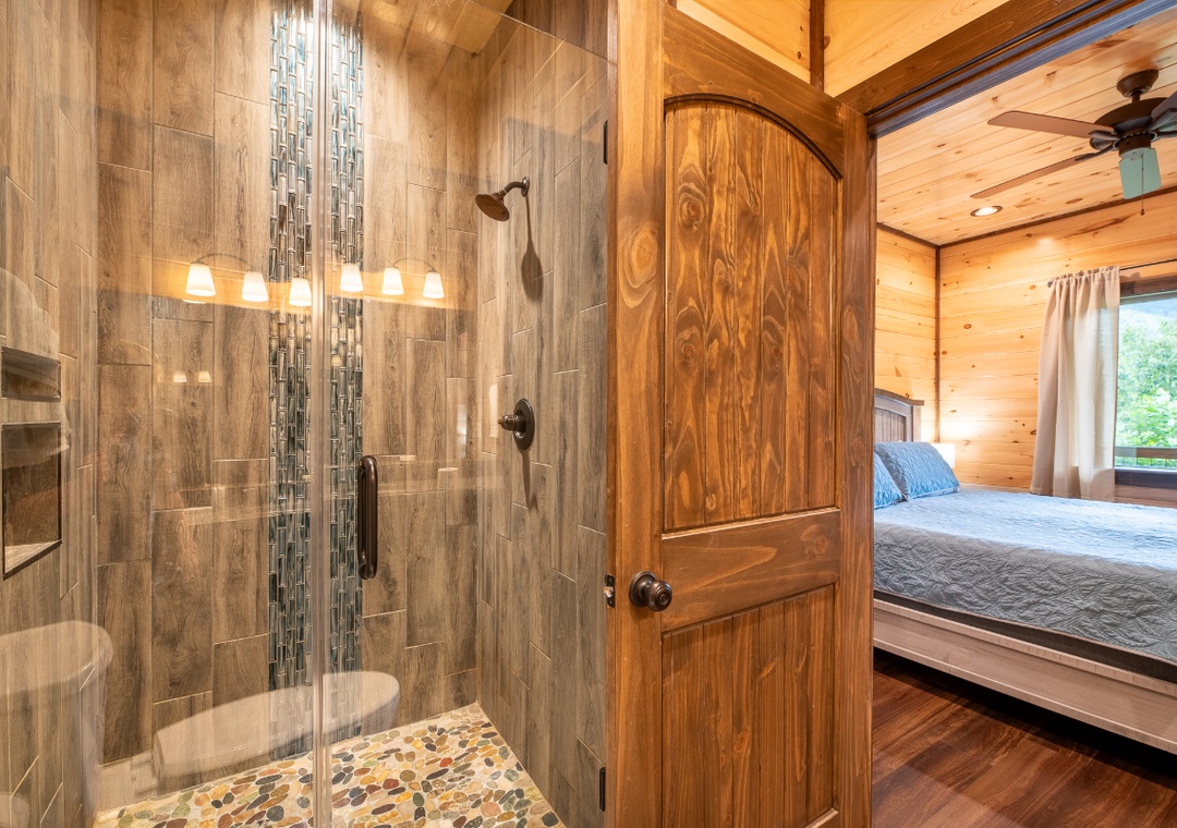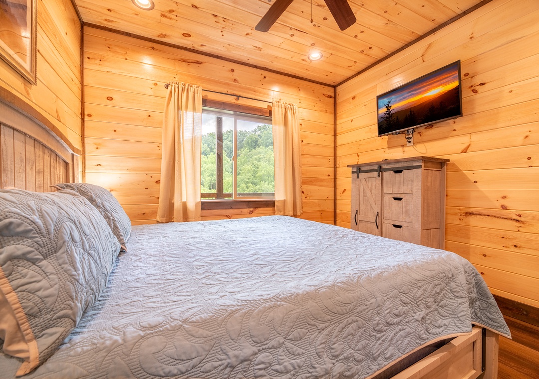 ✔ Bedroom #2 (Lower Level): Comfy Bedroom with a King-size Bed, Flat-screen TV, and Attached Full Bathroom with Stand Up Shower