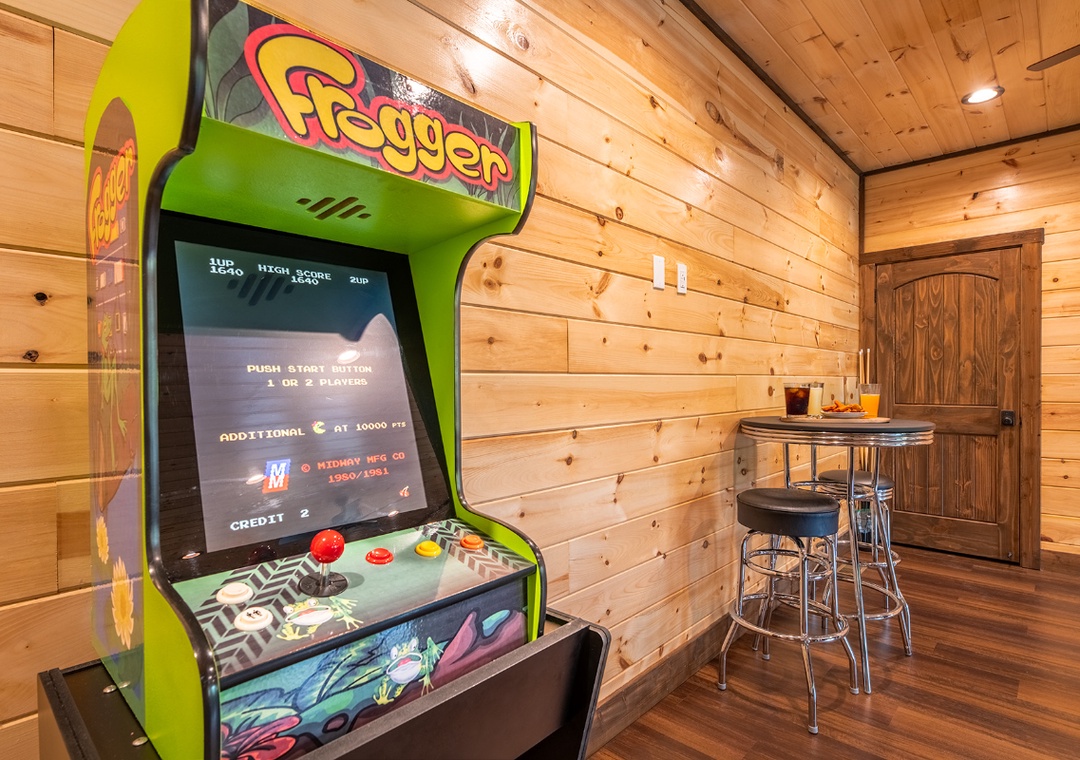 On the main level, the open living area invites you to gather around the cozy electric fireplace while watching your favorite shows or movies on the 55" TV with Roku Box. Step outside to the spacious back deck where the fun continues with a propane grill for cooking up delicious meals and a propane fire pit perfect for evenings spent sharing stories under the stars. The real showstopper, however, is the fully equipped game and theater room. Designed for hours of enjoyment, this space features plush theater seating arranged in front of a 55" TV with Roku Box and DVD player for a true cinematic experience. In between movie marathons, you can rack up a game on the pool table, challenge your family to a round of corn hole, or take a trip down memory lane with the classic Ms. Pac-Man arcade machine. When it’s time to wind down, head to the lower level deck and slip into the private hot tub. The soothing jets and peaceful wooded views make it the ideal way to relax after a full day of fun.