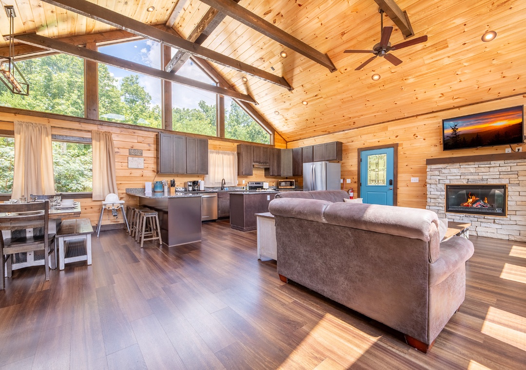 Step inside the open-concept main level that welcomes you with a seamless flow between the kitchen, dining, and living areas. The fully equipped kitchen offers everything you need to prepare home-cooked meals, while the spacious dining area invites lingering conversations over dinner. Just steps away, the living room centers around a cozy electric fireplace, perfect for curling up on cool mountain evenings, and a large 55" TV with a Roku Box so you can stream your favorite shows or movies without missing a beat. Downstairs, entertainment takes center stage in the cabin’s game and theater room, designed for both lively fun and laid-back movie marathons. Free WiFi is also available throughout the property.