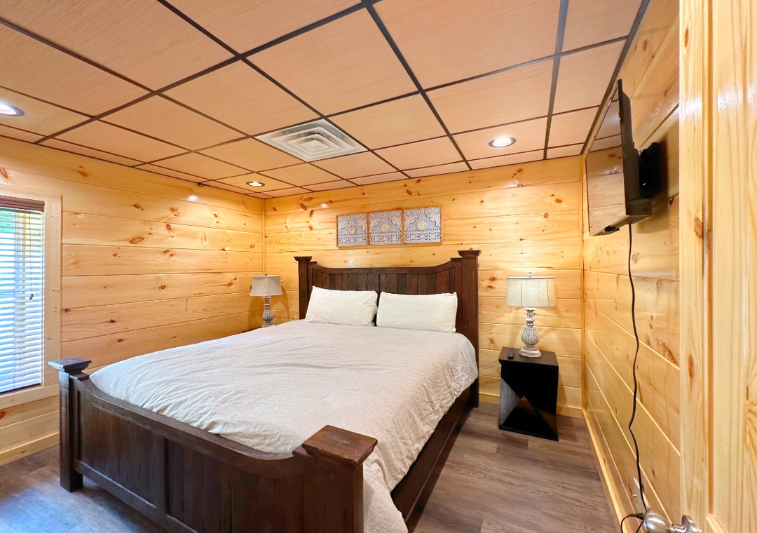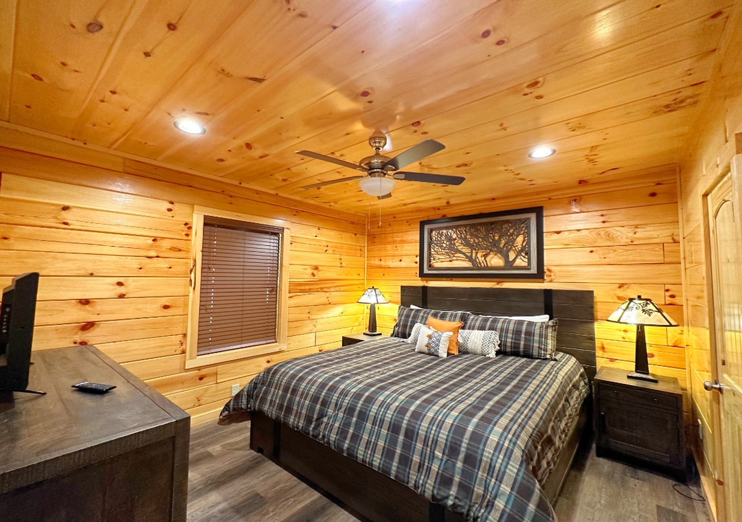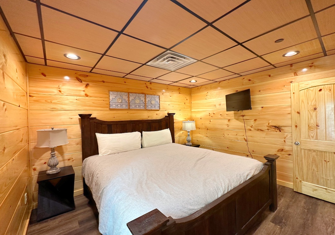 ✔ Bedroom #4 (Lower Level): Comfy Bedroom with a King-sized Bed and Flat-screen TV; Attached Full Bathroom with Shower/Tub Combo