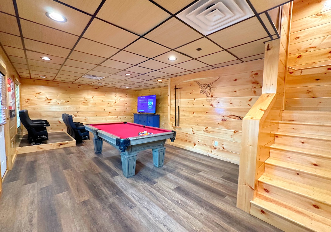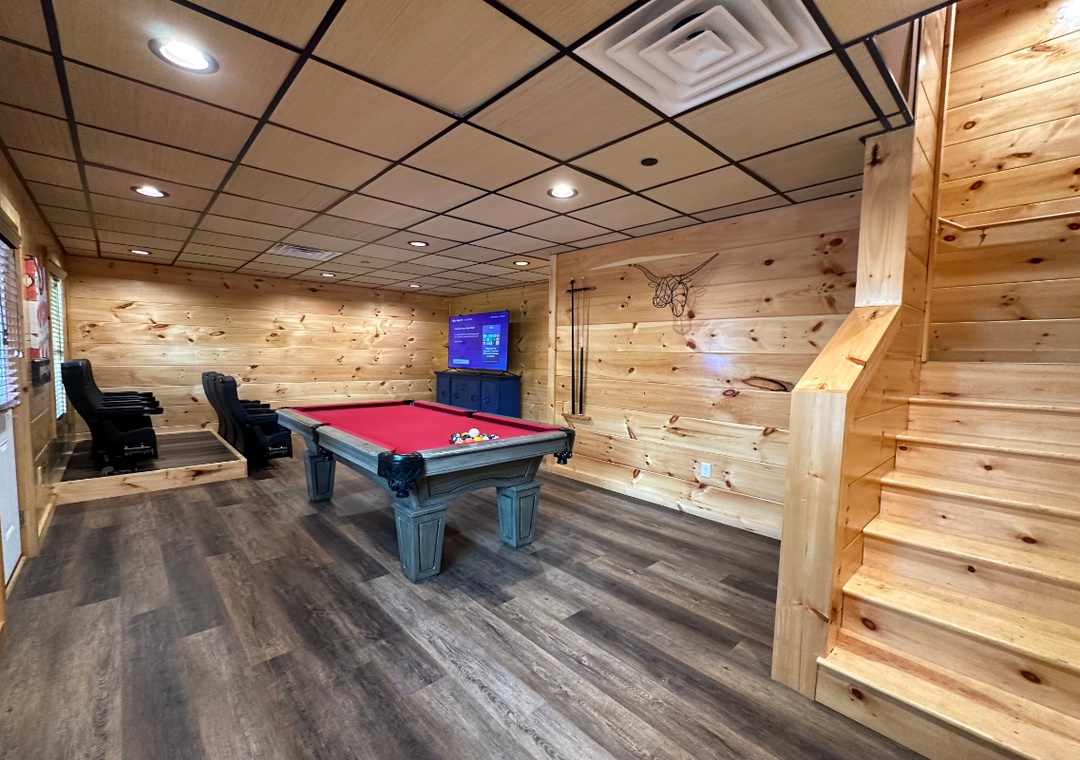 The crown jewel of “Shepherd's Rest” is undoubtedly its expansive game and theater room. This space features a full-sized pool table, perfect for friendly competition and casual play. The centerpiece, however, is the enormous 75” 4K Roku TV, providing an immersive movie-watching experience. You may also challenge your friends and family to a lively game of shuffleboard back in the living room. Step outside to find even more entertainment options. The upper-level deck is equipped with a propane grill for those who love to cook outdoors while the lower-level deck takes relaxation to the next level with a large hot tub. After a day of adventure or a thrilling game night, soak in the hot tub and unwind while taking in the stunning views. It’s the perfect spot to relax and recharge for another day of fun. At our lodge, entertainment is always at your fingertips, offering endless opportunities for fun and relaxation to you and your loved ones.