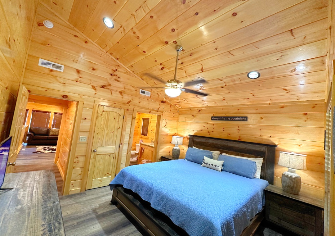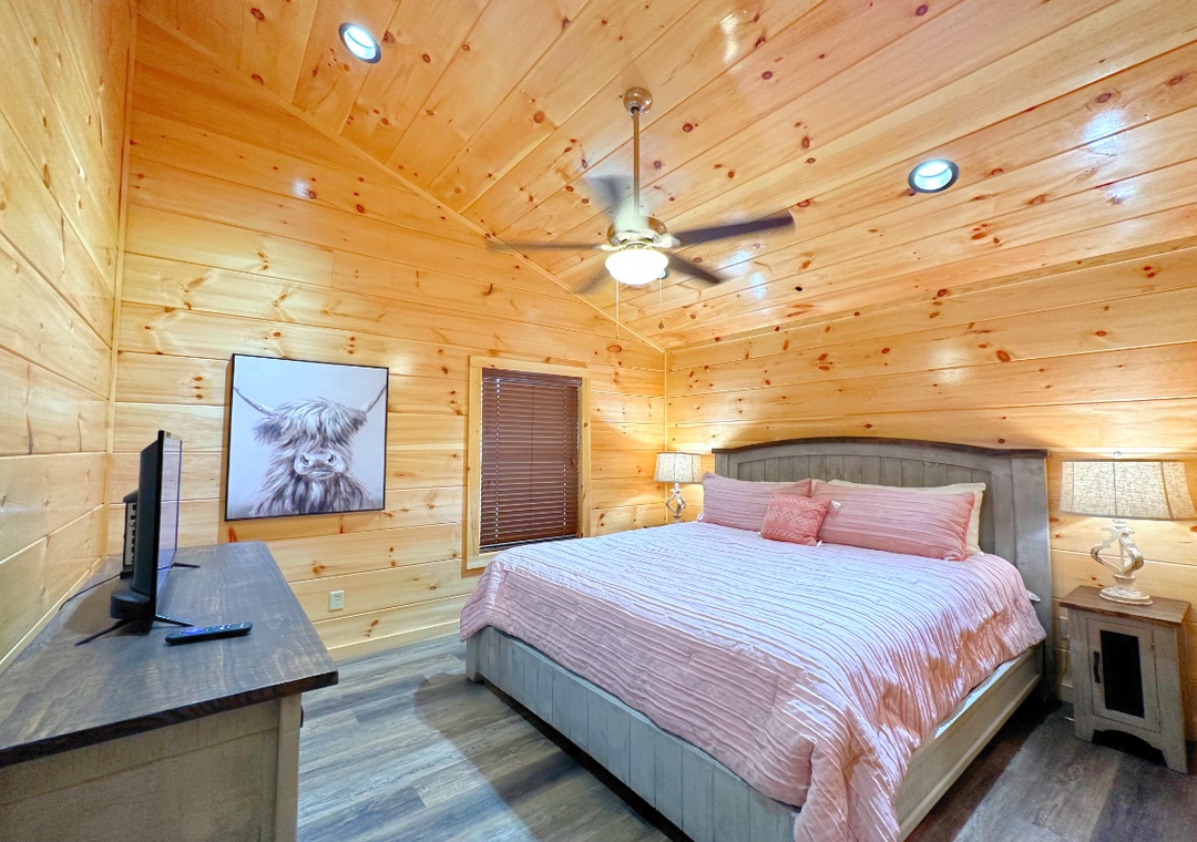 ✔ Bedroom #2 (Upper Level): Spacious Bedroom with a King-sized Bed and Flat-screen TV; Attached Full Bathroom with Shower/Tub Combo