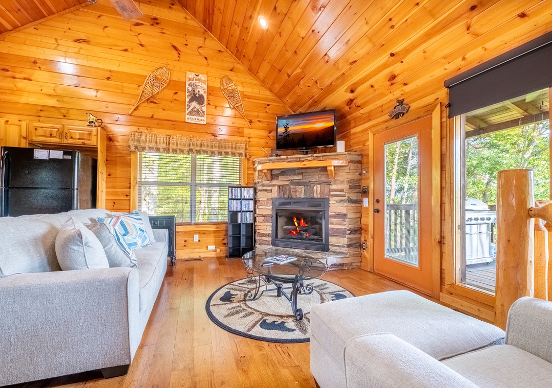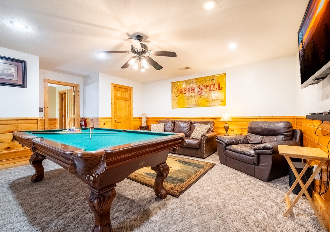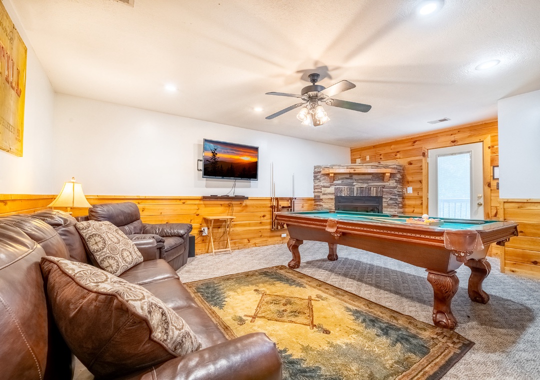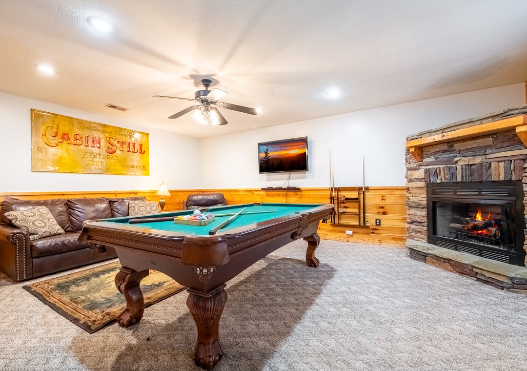The cabin greets you with the rich warmth of natural wood from floor to ceiling. The entire space exudes that classic mountain-home charm. The open-concept main level features a spacious living room that flows easily into the fully equipped kitchen and dining area. In the living area, you’ll find plush, comfortable seating arranged around a beautiful propane fireplace that offers the perfect ambiance for cooler mountain nights. Kick back and enjoy a movie night on the 48" Smart TV with a DVD player, or just curl up with a good book while the fire glows nearby. Head downstairs and you’ll discover a space designed for both relaxation and entertainment. At the center of it all is a pool table for friendly games, a cozy seating area, a second propane fireplace, and a 50" TV with a Roku Stick that allows you to stream your favorite shows or movies. Free WiFi is also available throughout the property.