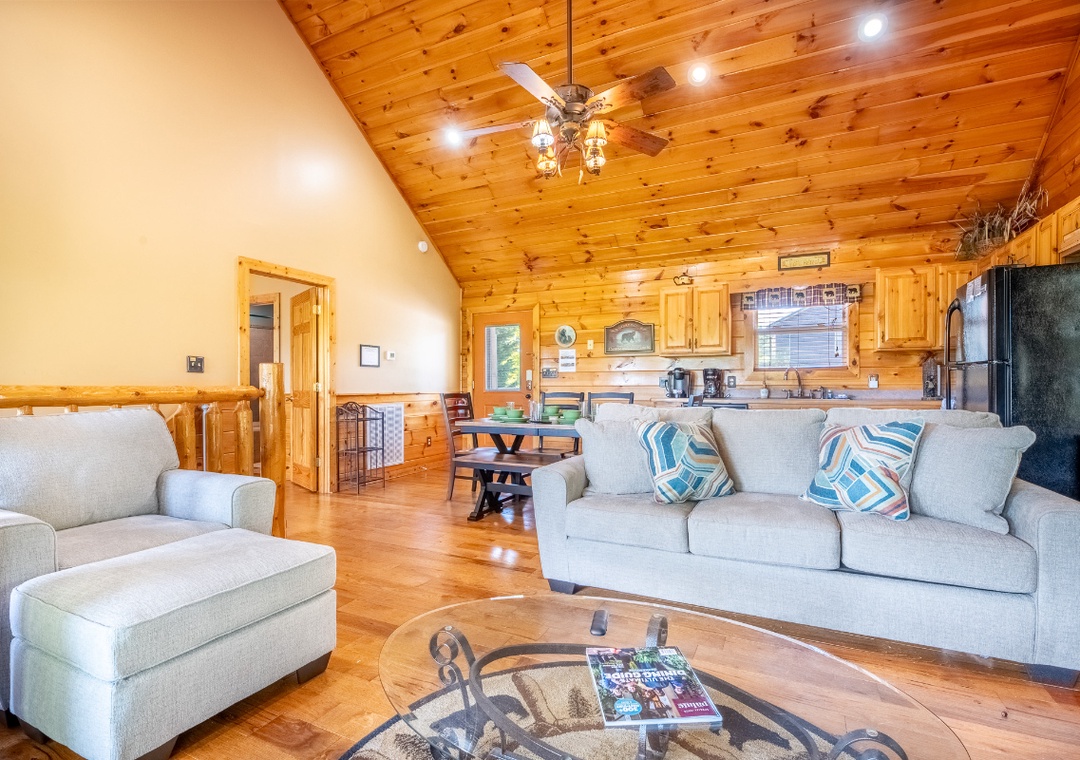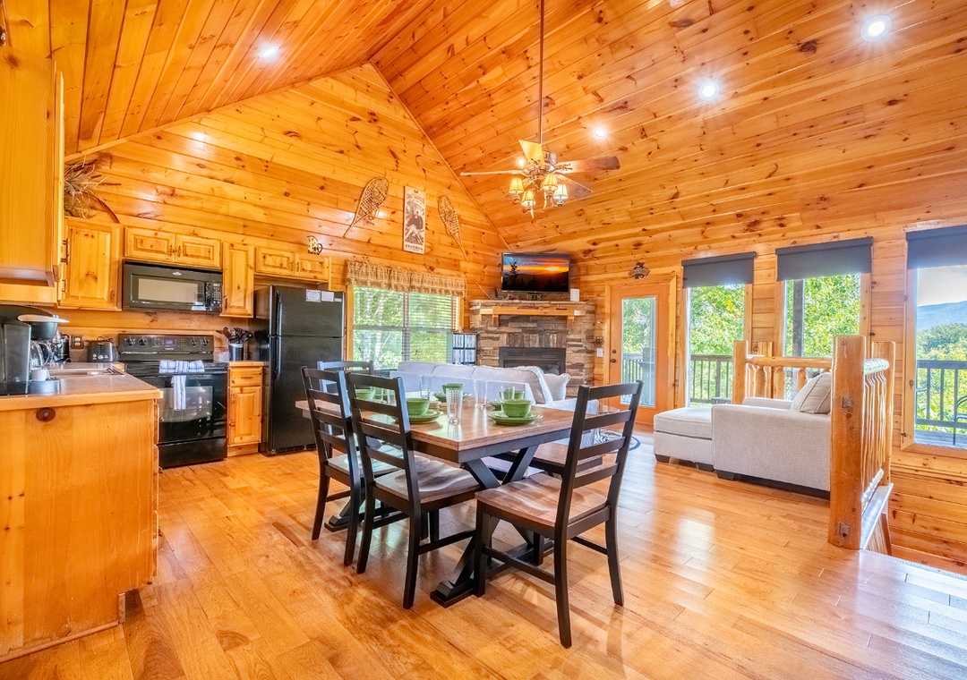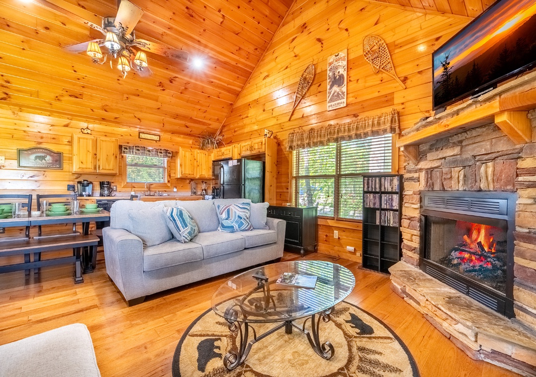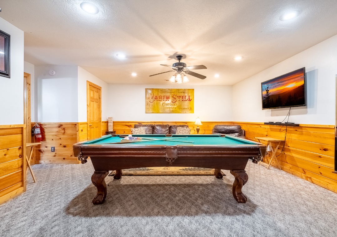 The cabin greets you with the rich warmth of natural wood from floor to ceiling. The entire space exudes that classic mountain-home charm. The open-concept main level features a spacious living room that flows easily into the fully equipped kitchen and dining area. In the living area, you’ll find plush, comfortable seating arranged around a beautiful propane fireplace that offers the perfect ambiance for cooler mountain nights. Kick back and enjoy a movie night on the 48" Smart TV with a DVD player, or just curl up with a good book while the fire glows nearby. Head downstairs and you’ll discover a space designed for both relaxation and entertainment. At the center of it all is a pool table for friendly games, a cozy seating area, a second propane fireplace, and a 50" TV with a Roku Stick that allows you to stream your favorite shows or movies. Free WiFi is also available throughout the property.