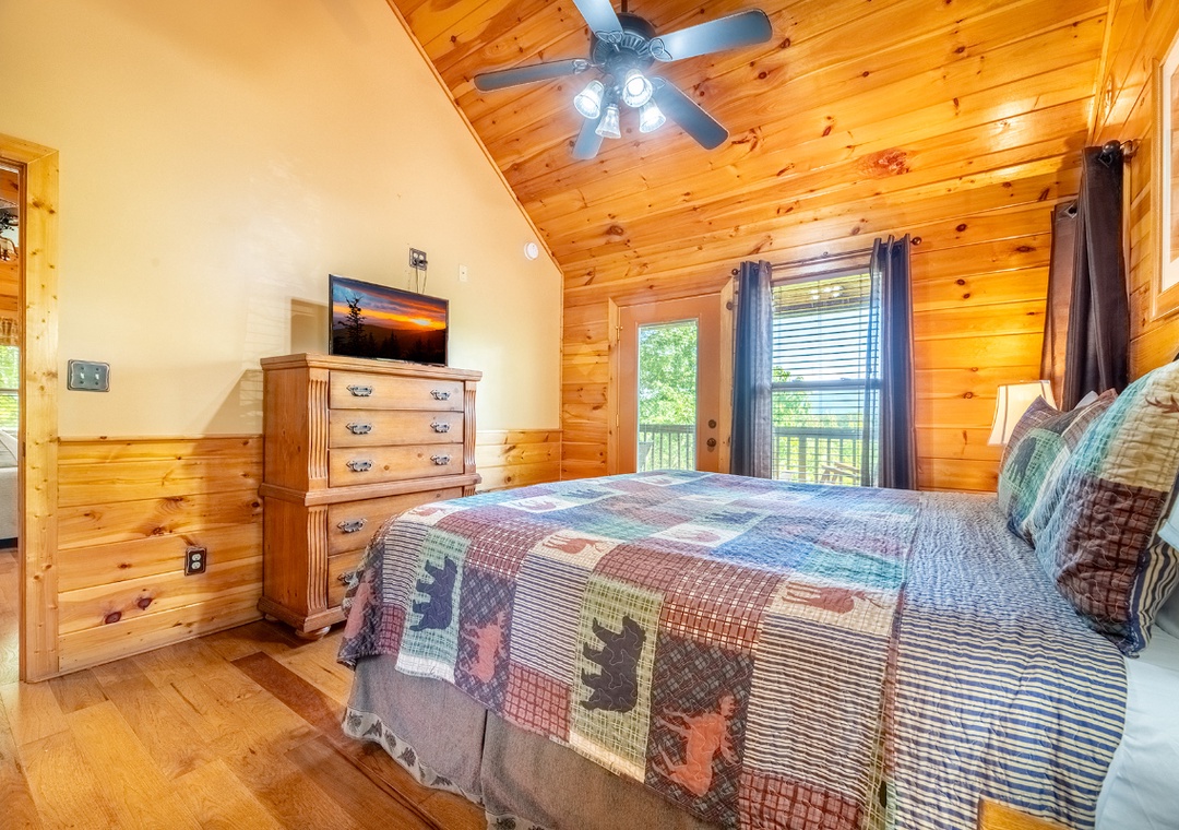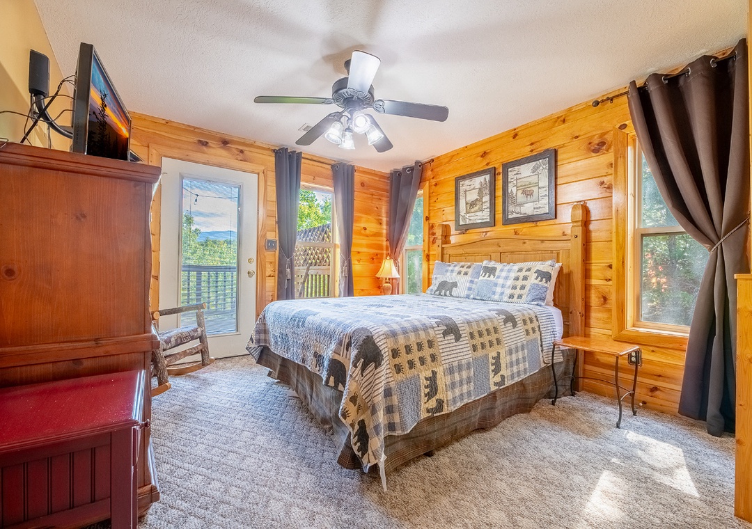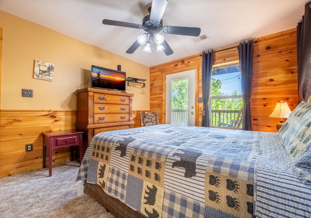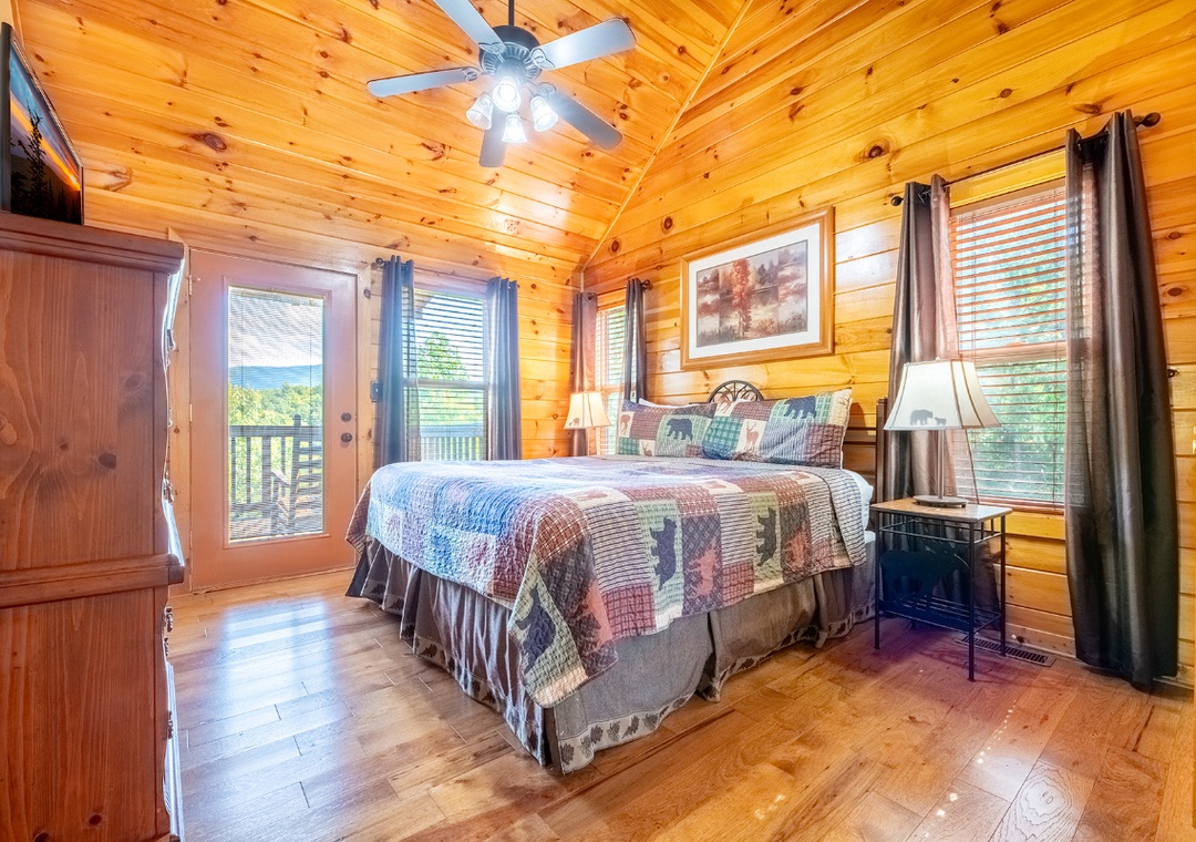 ✔ Bedroom #1 (Main Level): Spacious Bedroom with a King-sized Bed and a Flat-screen TV; Attached Full Bathroom with Shower/Jacuzzi Combo with direct deck access