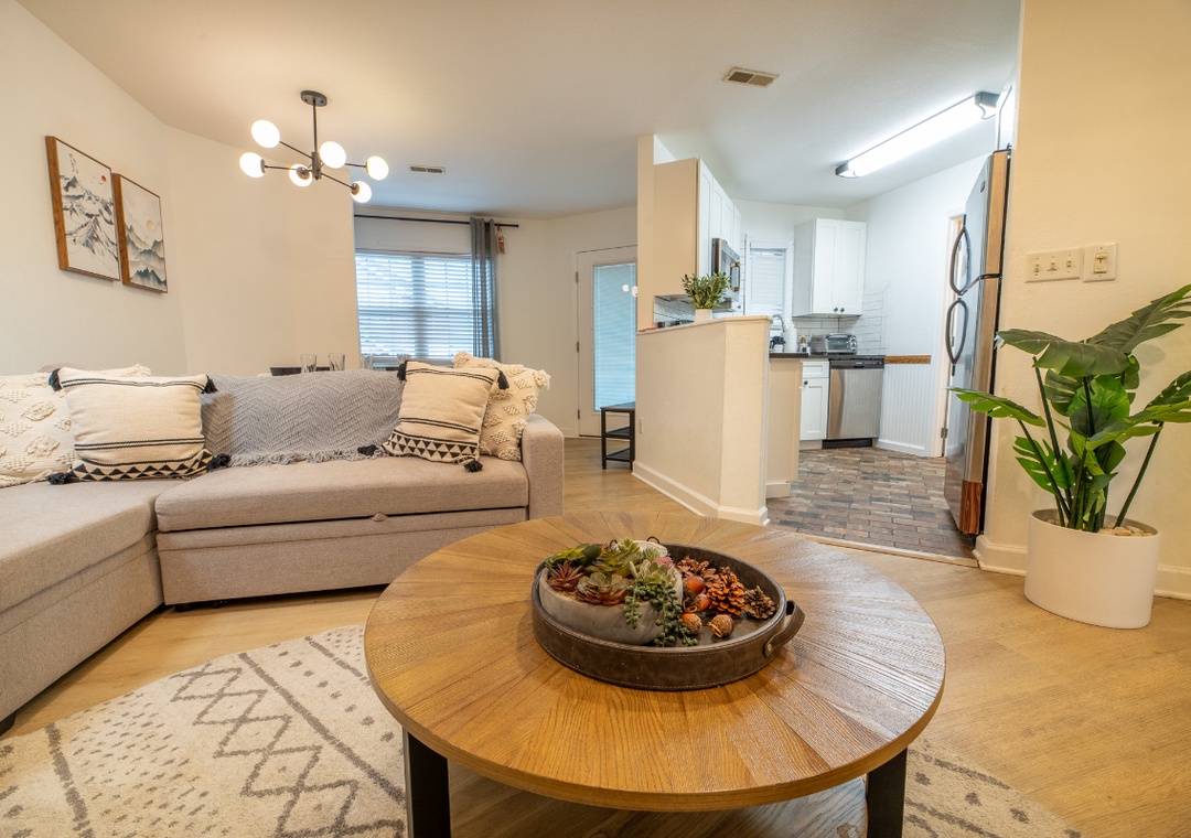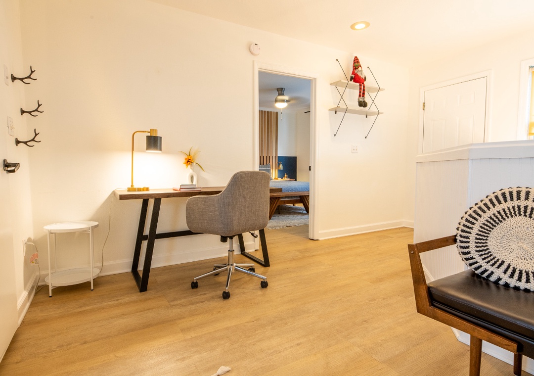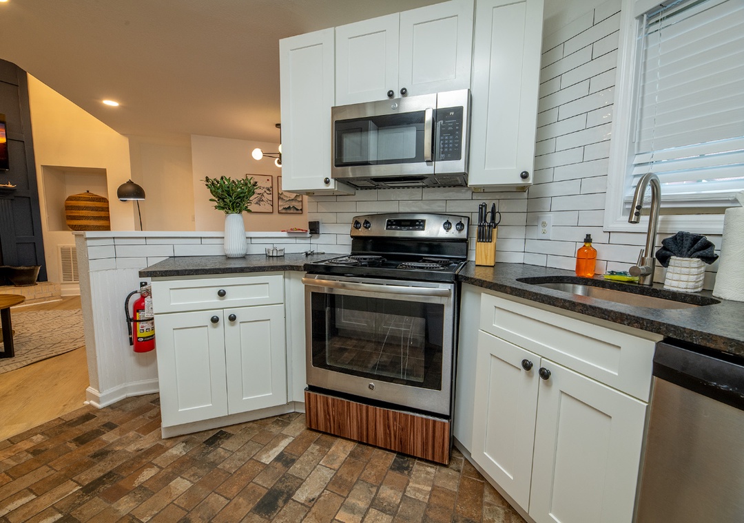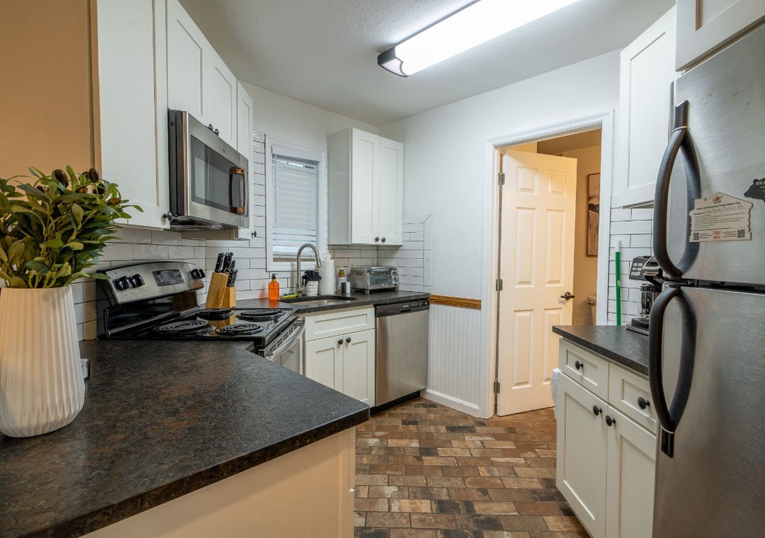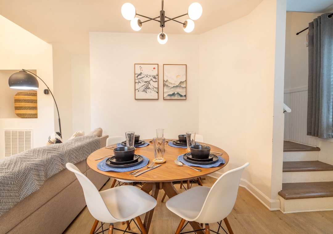 The fully-equipped kitchen is complete with everything you need to prepare home-cooked meals. Full-sized refrigerator, dishwasher, stove, microwave, and other kitchen appliances perfect for making breakfast, lunch, or dinner throughout your stay! All pots, pans, glasses, plates, silverware, etc. are also there for you! Gather around the inviting dining table to share stories and laughter.