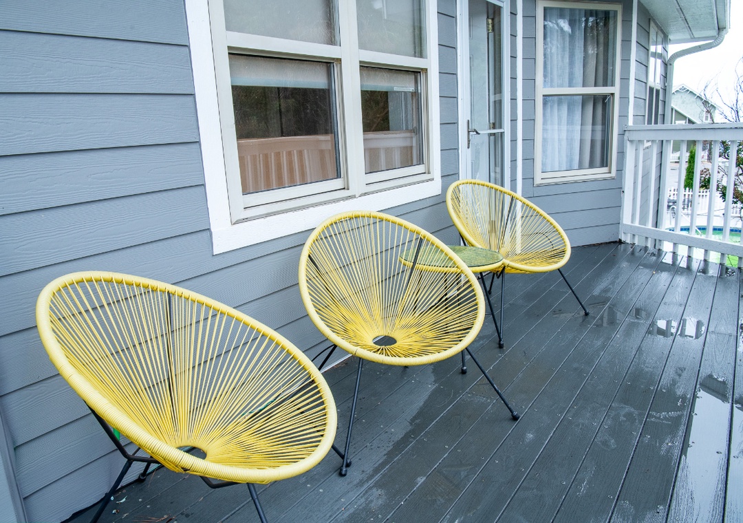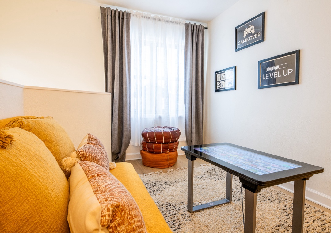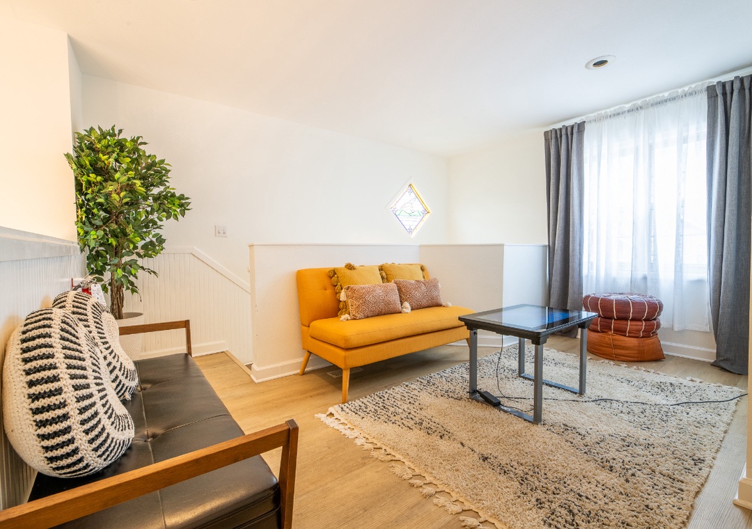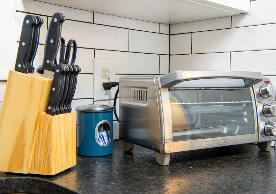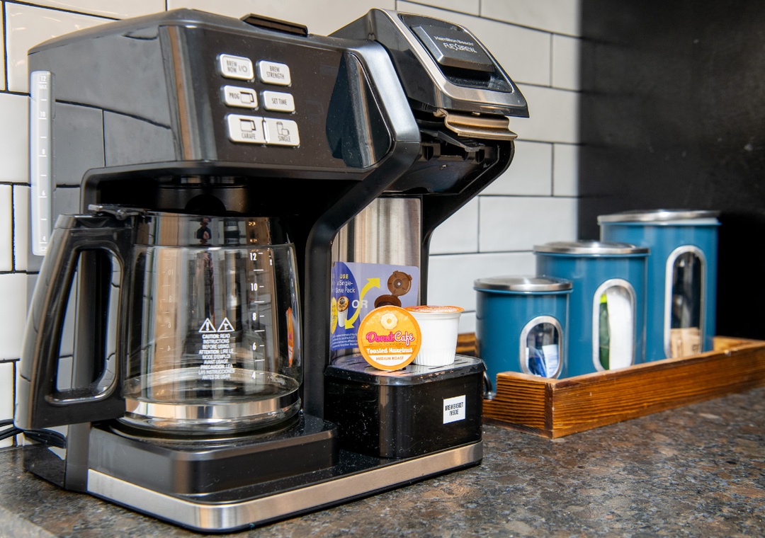 The fully-equipped kitchen is complete with everything you need to prepare home-cooked meals. Full-sized refrigerator, dishwasher, stove, microwave, and other kitchen appliances perfect for making breakfast, lunch, or dinner throughout your stay! All pots, pans, glasses, plates, silverware, etc. are also there for you! Gather around the inviting dining table to share stories and laughter.