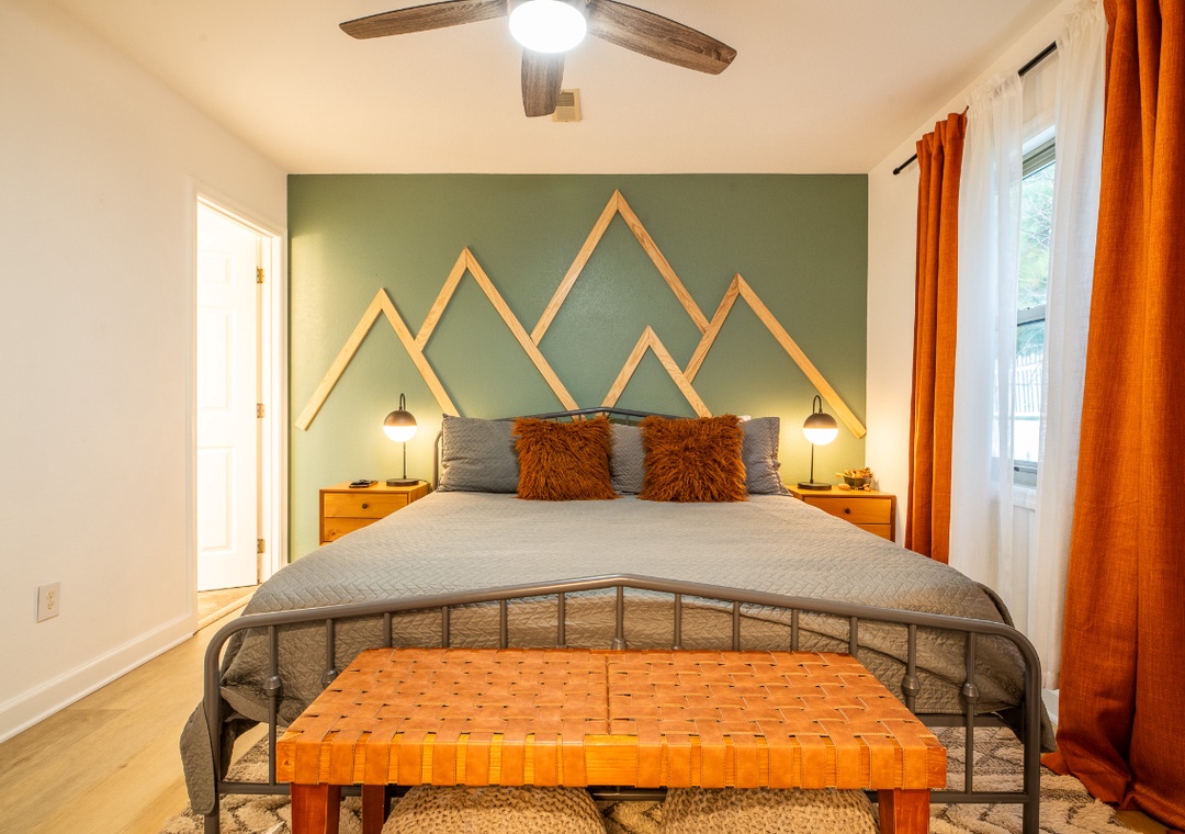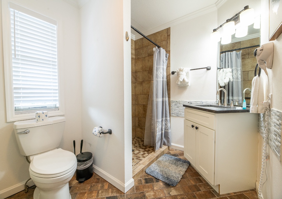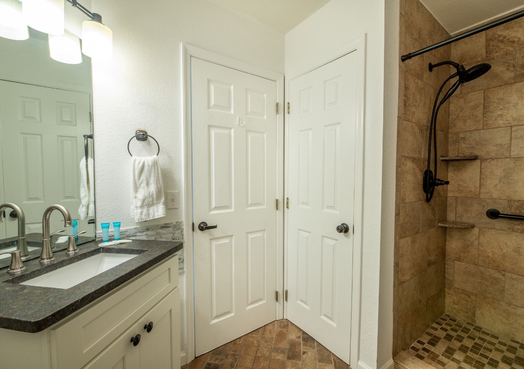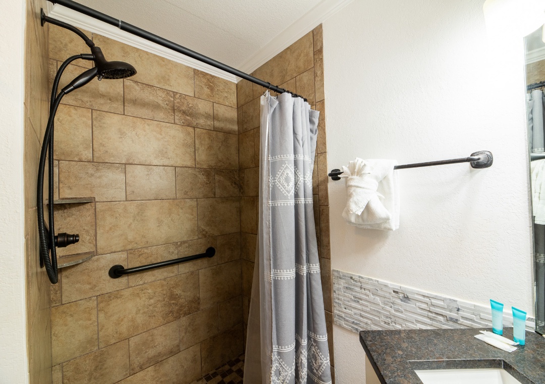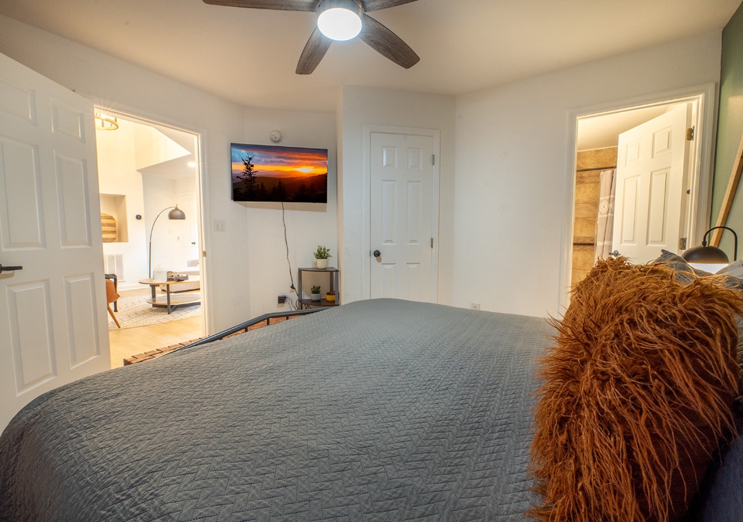✔ Bedroom #2 (Main Level): Comfy Bedroom with a King-sized Bed and Flat-screen TV; Attached Full Bathroom with Stand Up Shower
