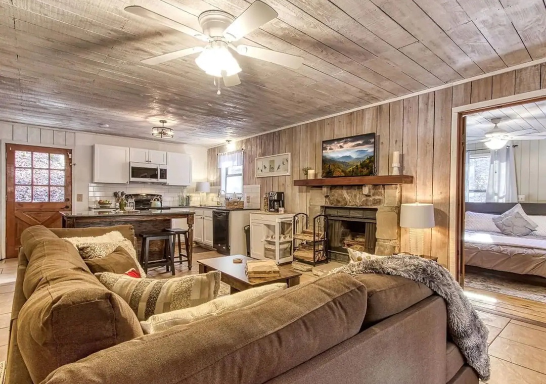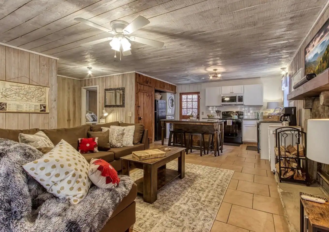This one-level home offers a spacious living area with a cozy stone fireplace, perfect for snuggling in the evening! With new cabin-chic décor, comfortable couches & furniture, 43" flat screen TV, work nook, and free Wi-Fi, you and your guests will be comfortable and relaxed the minute you arrive to Sleepy Bear.
