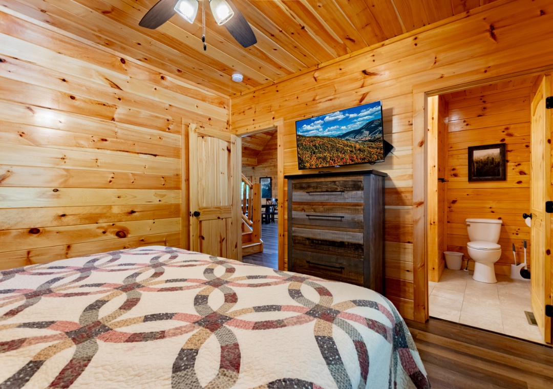 ✔ Bedroom #2 (Main Level): Cozy Bedroom with a King-sized Bed and Flat-screen TV; Attached Full Bathroom with Shower/Tub Combo