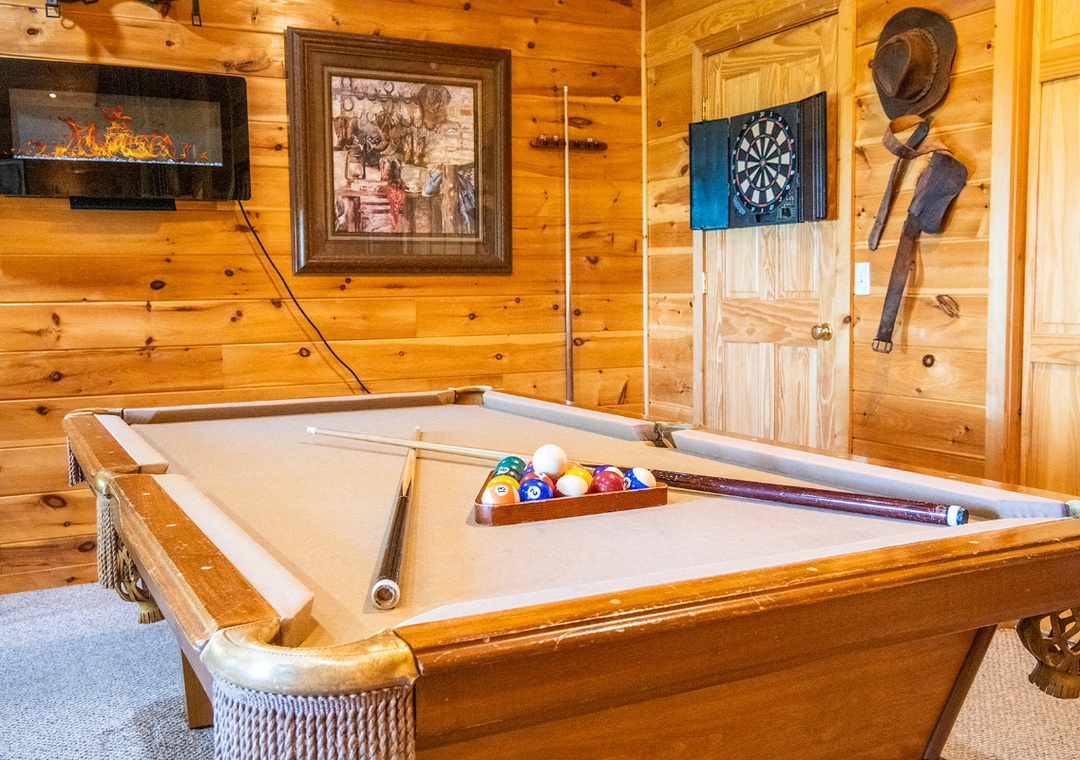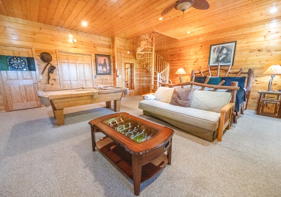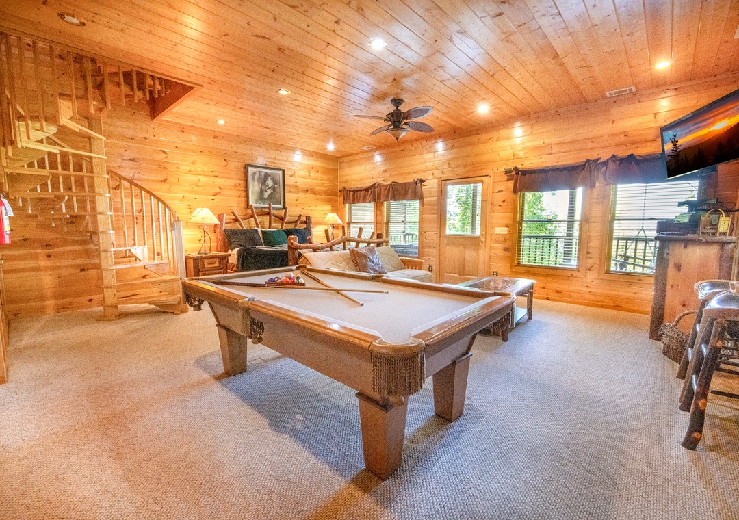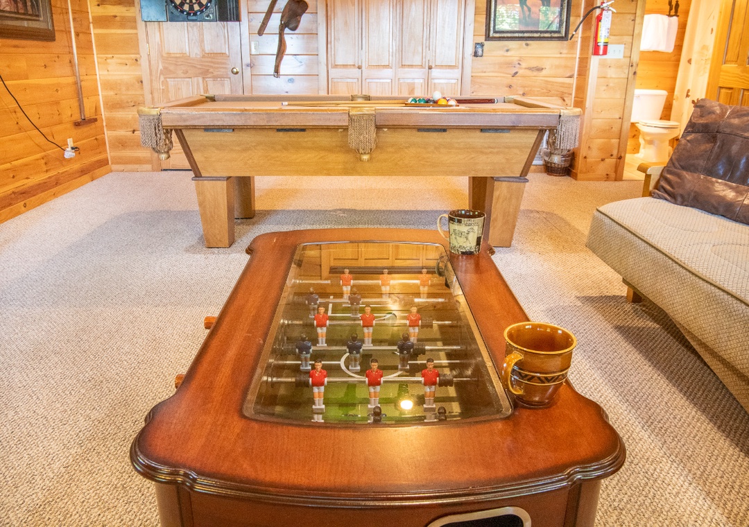 As you enter, you’re greeted by an inviting and open living room boasting towering high ceilings and large windows framing the serene views of the resort and Smoky Mountain landscape. The abundance of natural light fills the room, creating a bright and airy atmosphere and during the colder months, the propane fireplace provides warmth and a cozy glow. The open-plan layout ensures that the living room flows seamlessly into the kitchen and dining area making it easy to prepare home-cooked meals. Downstairs, the bedroom/game area offers a perfect mix of comfort and fun. The bedroom features a plush King-size bed, perfect for retreating after a long day. An electric fireplace adds a gentle warmth to the space, making it feel cozy and inviting, especially on cool mountain evenings. This lower level also transforms into a game lover’s paradise with a pool table and a small foosball table, providing hours of entertainment without ever having to leave the cabin. Free WiFi is also available throughout the property.