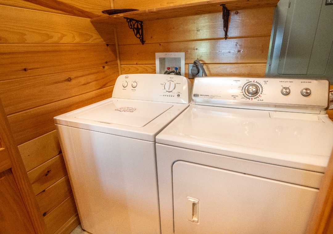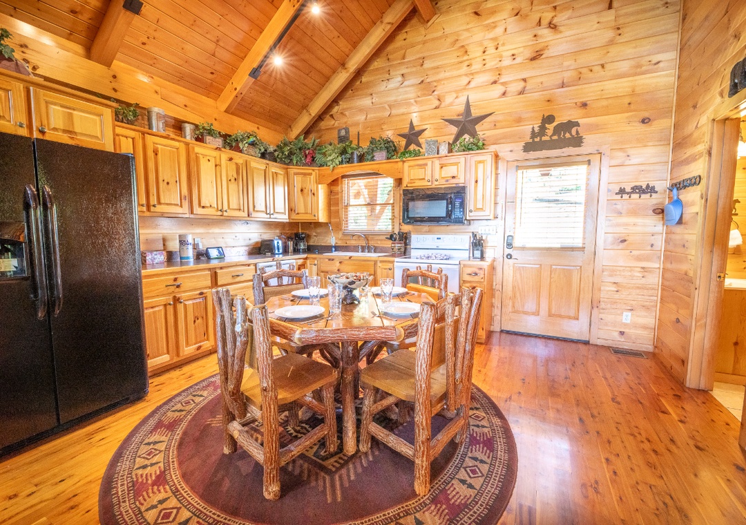 The fully-equipped kitchen is a chef's dream. Complete with a full-sized refrigerator, dishwasher, stove, microwave, and other kitchen appliances perfect for making breakfast, lunch, or dinner throughout your stay! All pots, pans, glasses, plates, silverware, etc. are also there for you! Adjacent to the kitchen, the inviting dining area beckons with its rustic charm and elegance where you can gather at the breakfast bar for a cozy meal.