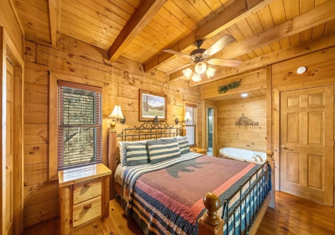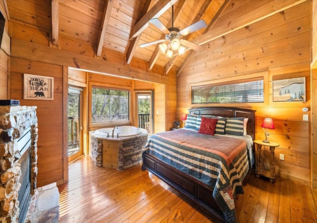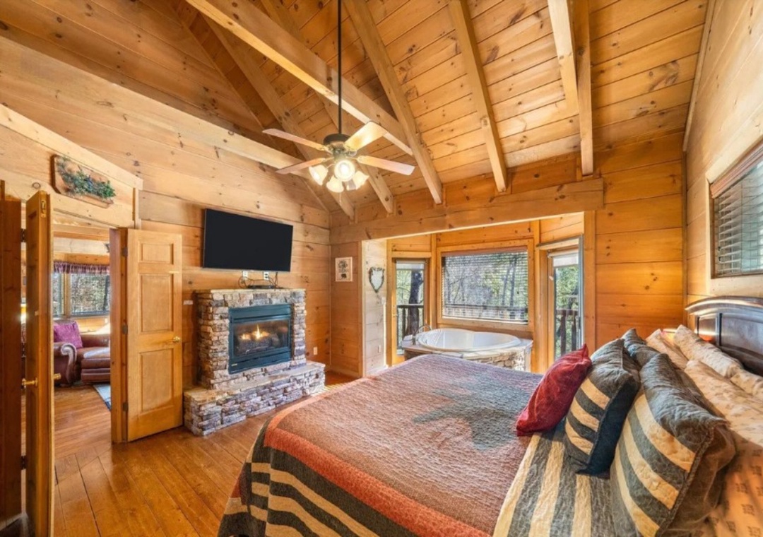✔ Bedroom #1 (Main Level): Spacious Bedroom with a King-Bed, Fireplace and Flatscreen TV; Attached Full Bathroom with Stand Up Shower and Separate Jacuzzi