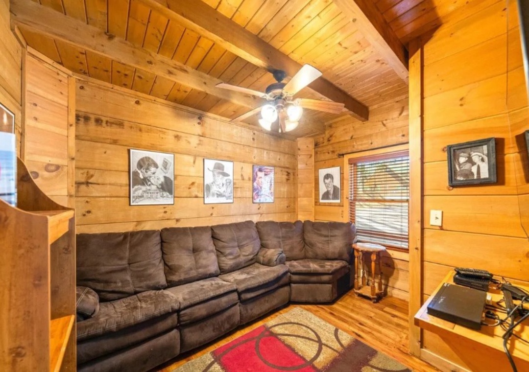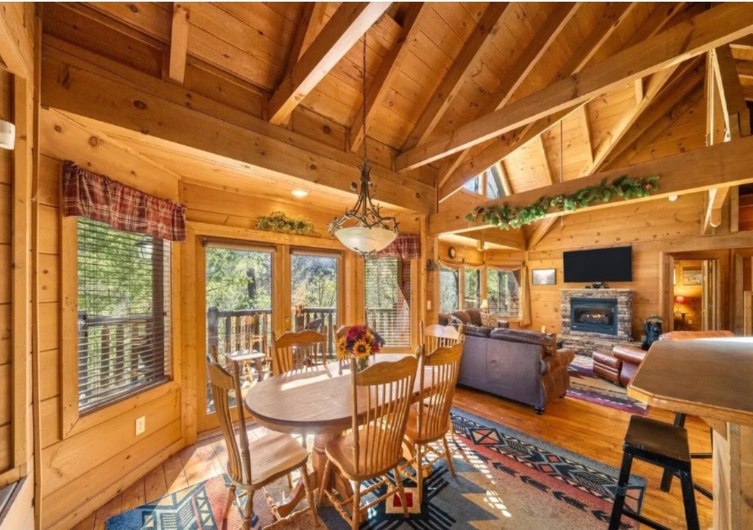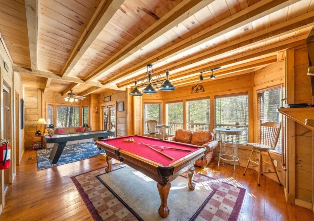 The main level showcases an open floor plan that serves as the heart of the cabin, making it the perfect gathering spot for your group. The living room features a stunning wall of windows that frames the wooded scenery and fills the space with natural light throughout the day. A propane fireplace adds warmth and ambiance, creating a cozy atmosphere for evenings spent relaxing indoors. The open layout seamlessly connects the living area with the kitchen and dining room, making it easy for everyone to spend time together. Downstairs, the spacious lower level expands your relaxation options with an inviting game room and theater room, perfect for friendly matches or catching up with your favorite shows. Free WiFi is also available throughout the property.
