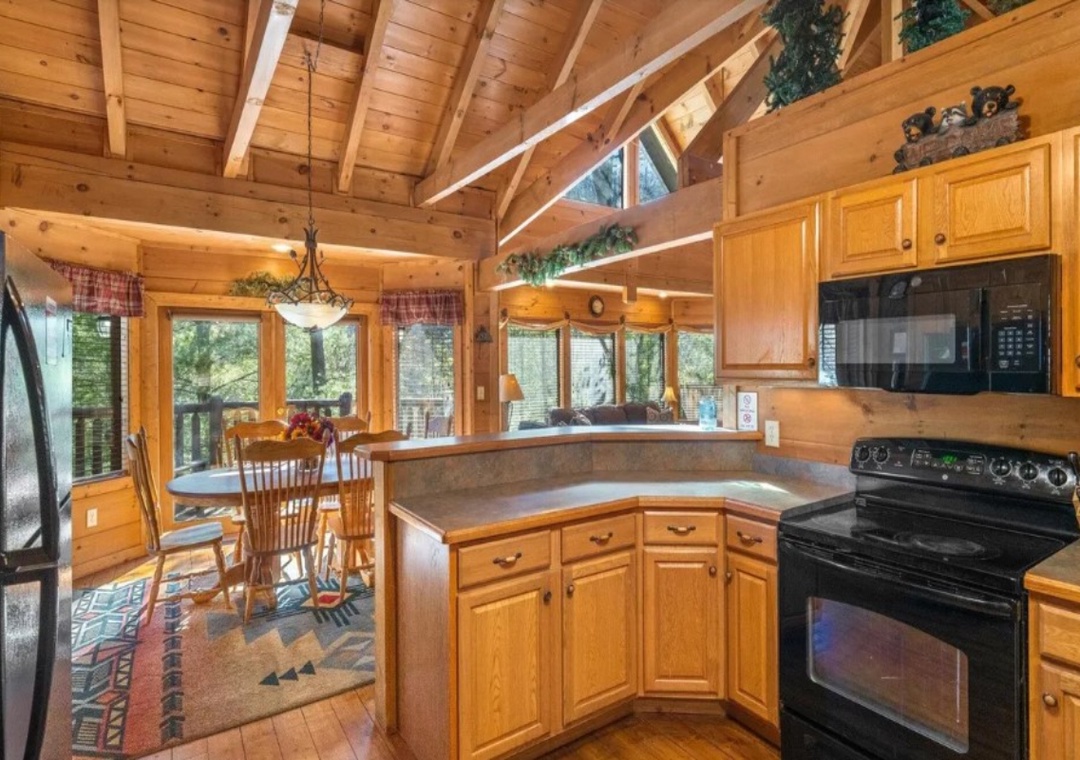 The fully-equipped kitchen boasts modern amenities, making it easy to prepare delicious meals for your family or friends. Well-appointed with a refrigerator, stove, microwave, and other kitchen appliances, perfect for making breakfast, lunch, or dinner throughout your stay! All pots, pans, glasses, plates, silverware, etc., are also there for you! Gather around the inviting dining table or take your food outside to the alfresco picnic table to share stories and laughter while basking in the serene wooded views.