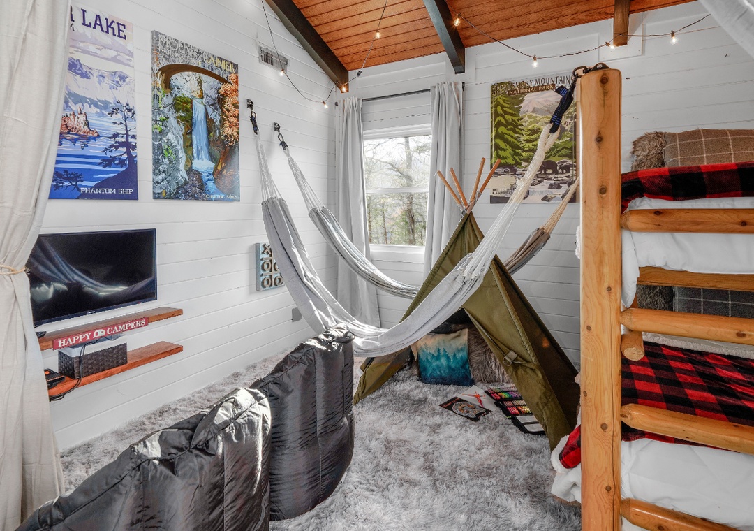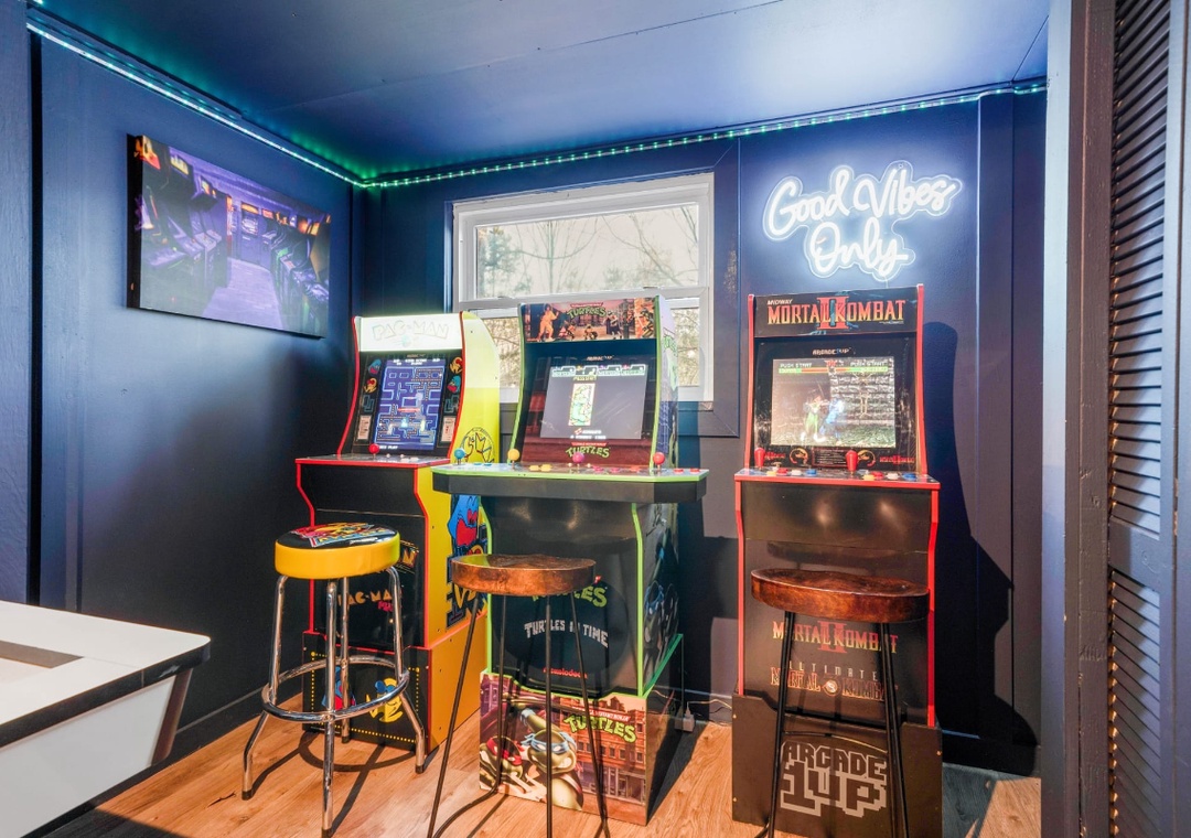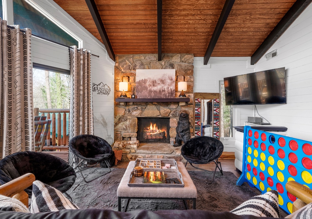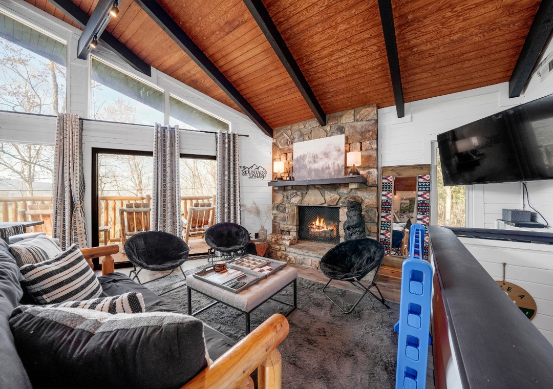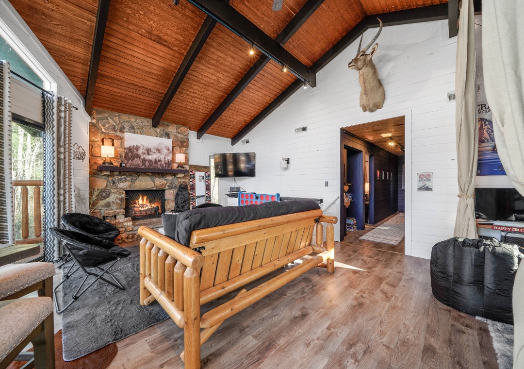 The highlight of the cabin is the massive lower-level game room fully loaded with four arcade machines, a full-size pool table, air hockey, and even a photo area with props for capturing those fun vacation memories. When you’re ready to step outside, the entertainment doesn’t stop. Just beyond the game room, the lower-level back deck features a private hot tub where you can soak under the stars or relax after a long day of adventures. You’ll also find a propane grill on this level, perfect for outdoor cookouts with friends and family. Next to the deck, you’ll discover the outdoor gaming area, designed for casual competition and cozy evenings. Play a few rounds of cornhole or throw darts under the trees, then gather around the propane firepit for storytelling, s’mores, and stargazing. Back inside, the fun continues throughout the cabin. In the living room, gather around the 65-inch Smart TV for movie nights or streaming your favorite shows. The upstairs loft serves as a second living space with its own fireplace, plenty of natural light, and a mix of board games, books, and tic-tac-toe games that kids and adults alike will enjoy. The entertainment options extend beyond the cabin, too. As a guest of Smoky Fox Lodge, you’ll have access to the seasonal community pool at Shagbark Resort. For those looking to explore, you're just 15 minutes from the action-packed attractions of Pigeon Forge, including Dollywood, The Island, go-karts, mini golf, and dozens of restaurants and shows.