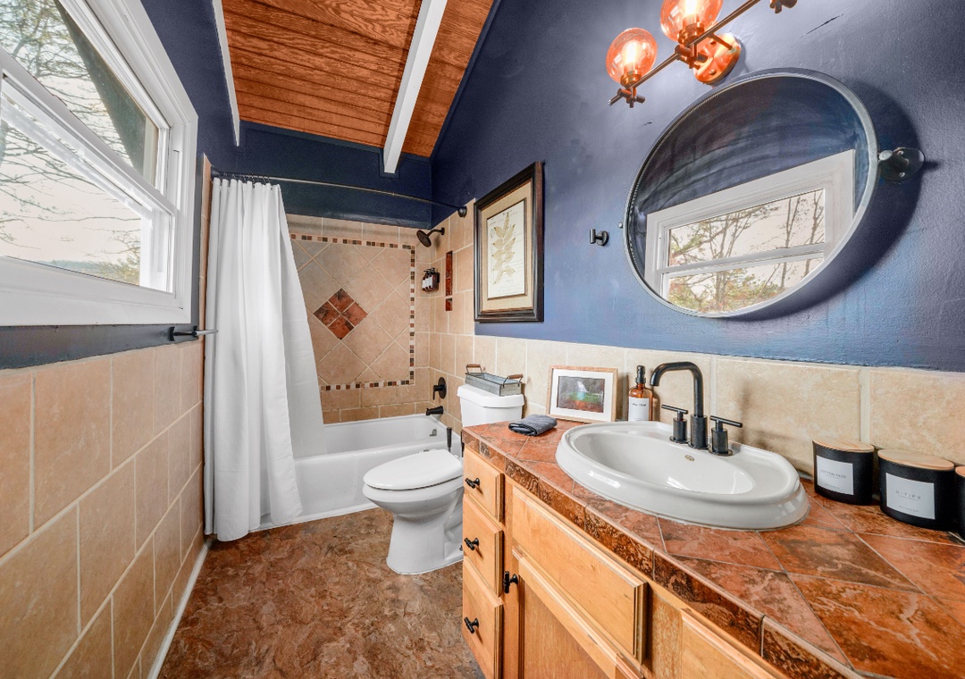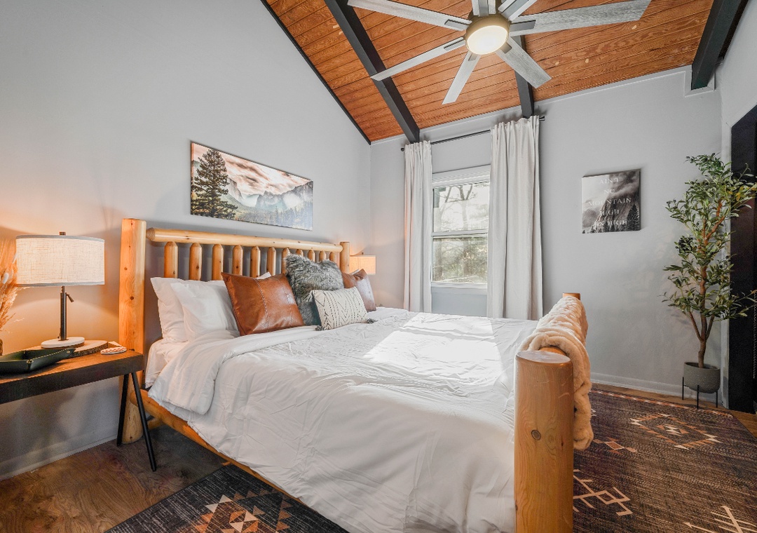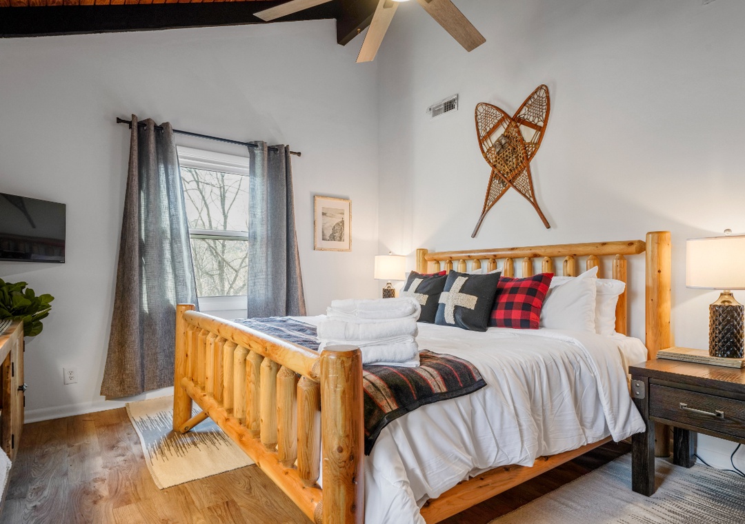 ✔ Bedroom #2 (Upper Level): Comfortable Bedroom with a King-sized Bed, Reading Nook, and a Flat-screen TV; Access to a Full Bathroom with Shower/Tub Combo
