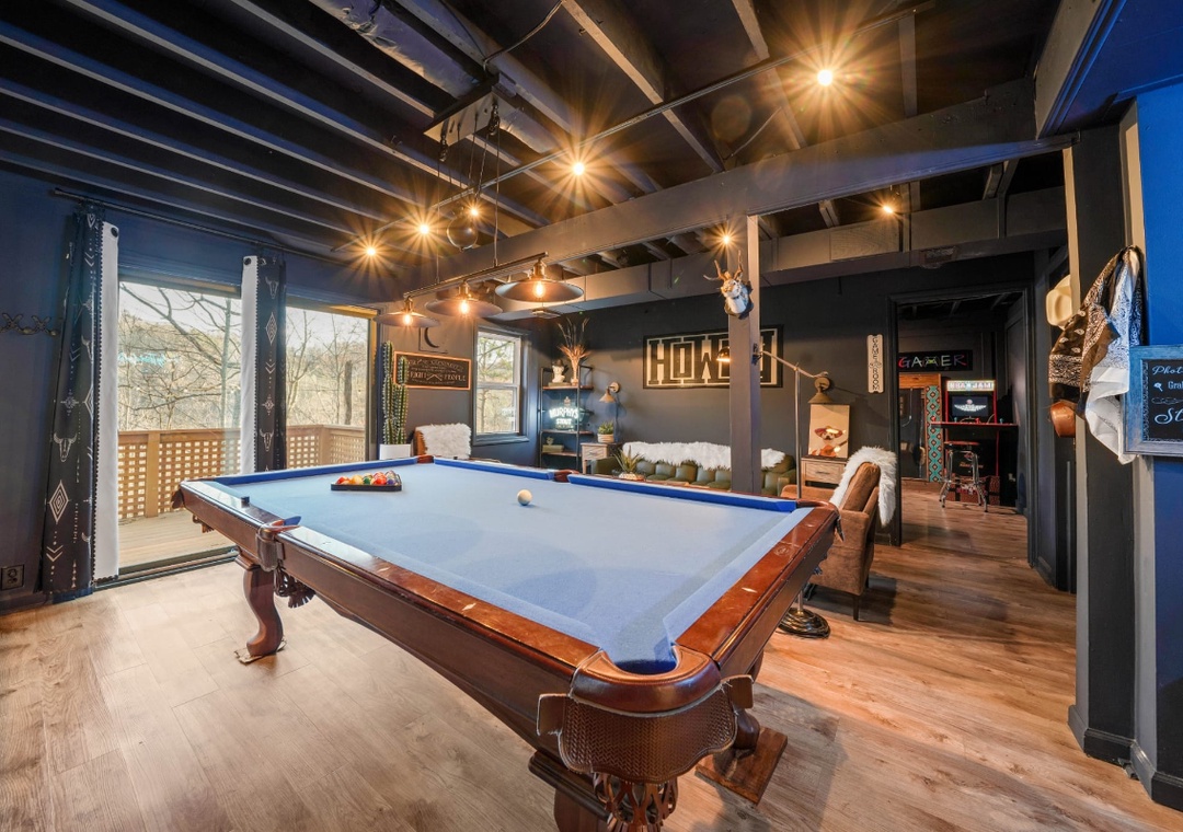 The heart of the home is the expansive great room. Large windows stretch across the room, filling the space with natural light and offering peaceful wooded views that bring the outside in. A beautiful stone fireplace becomes the centerpiece of the room, casting a warm glow as your group gathers on plush seating for movie nights on the 65-inch Smart TV. Just off the great room is the open-concept kitchen and dining area, making it easy to prepare meals while still being part of the conversation. Head upstairs and you’ll find a spacious loft that acts as a second indoor living area, complete with a charming stone fireplace and comfortable seating. Downstairs, the cabin transforms into an indoor entertainment hub with a large, fully outfitted game room. Also conveniently located on this lower level is a laundry area, so you can pack light and stay fresh throughout your stay. Free WiFi is also available throughout the property.