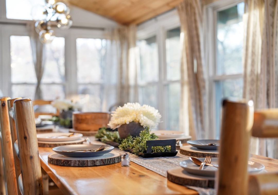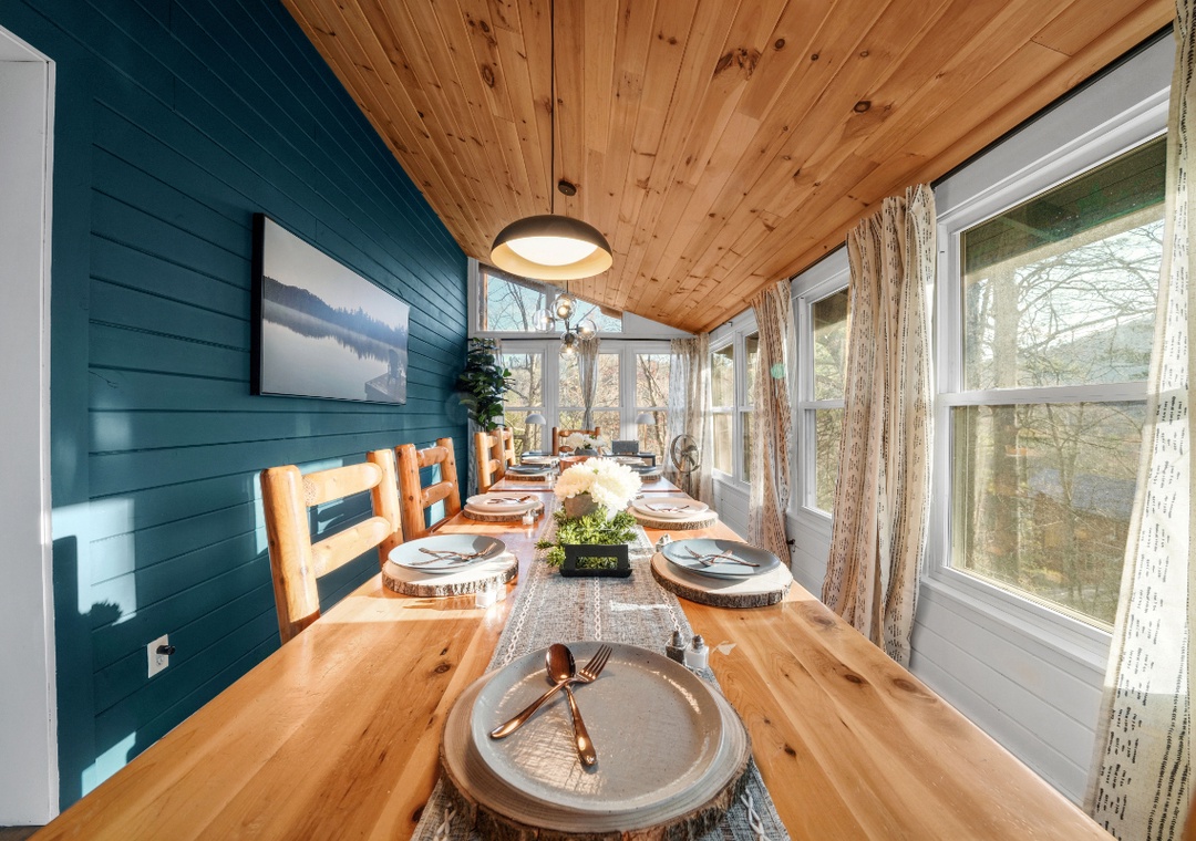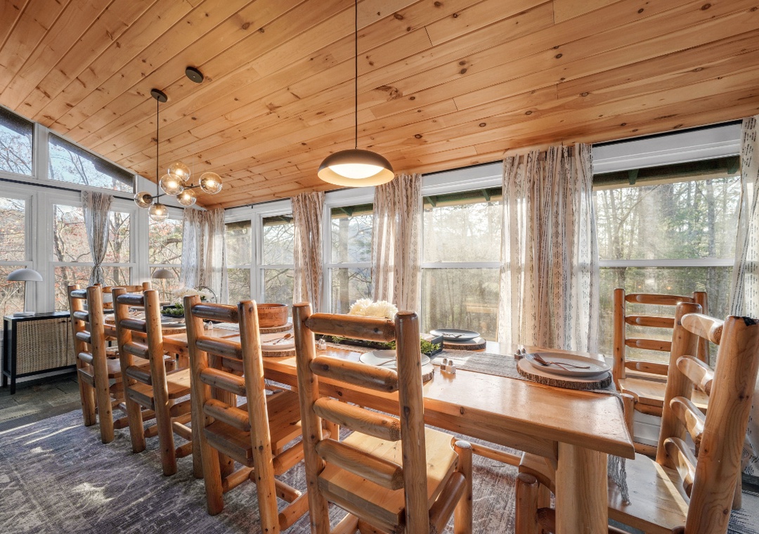 The fully-equipped kitchen boasts modern amenities, making it easy to prepare delicious meals for your family or friends. Well-appointed with a full-sized refrigerator, dishwasher, stove, microwave, and other kitchen appliances perfect for making breakfast, lunch, or dinner throughout your stay! All pots, pans, glasses, plates, silverware, etc., are also there for you! Gather around the inviting dining area with a wall of windows to share stories and laughter, as it invites you to savor each bite while taking in the natural beauty of the surroundings.