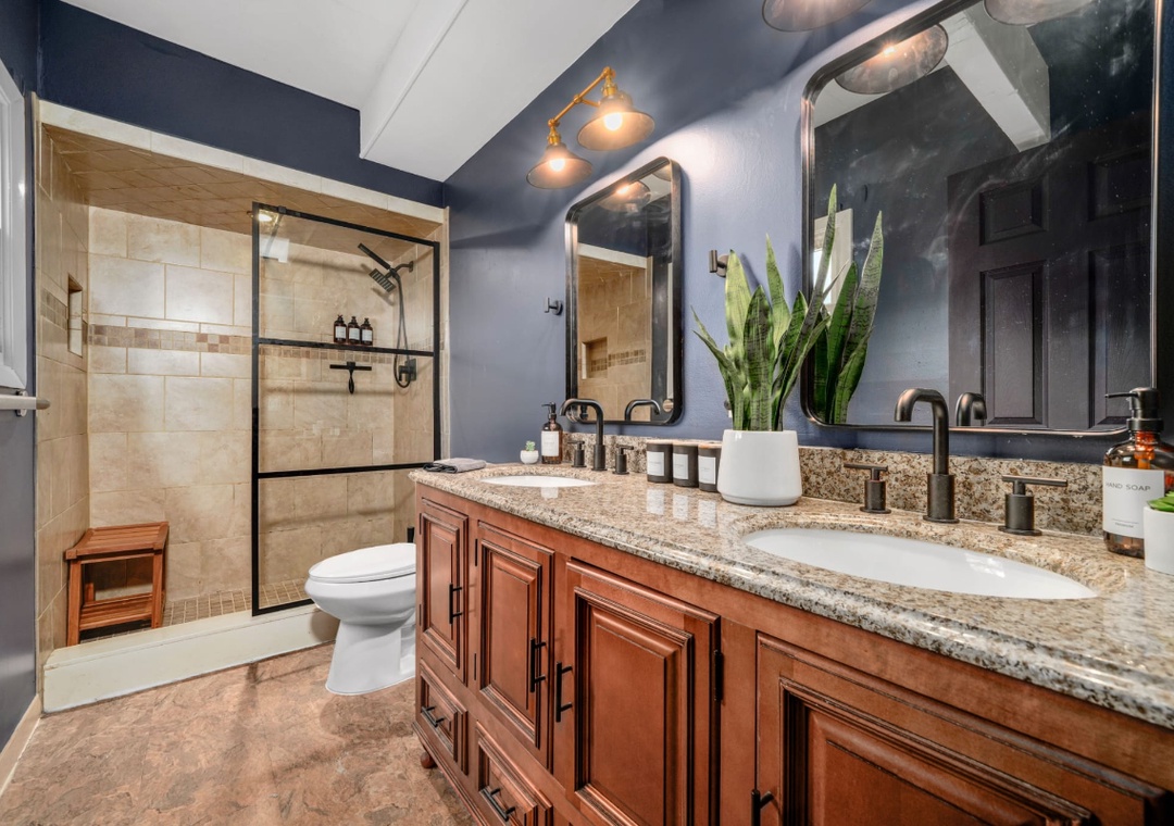 ✔ Bedroom #1 (Main Level): Spacious Bedroom with a King-sized Bed, Reading Nook,Coffee Bar, and Mini Fridge; Attached Full Bathroom with Stand Up Shower and Dual Sinks