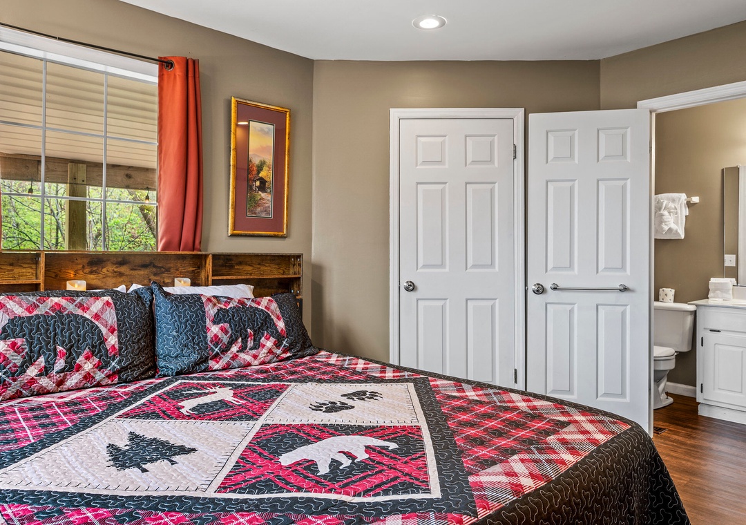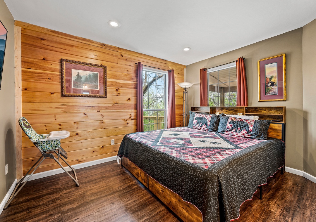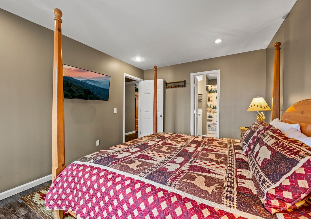 ✔ Bedroom #1 (Main Level): Spacious King Bedroom with flat-screen TV; Attached Full Bathroom with Shower/Tub Combo