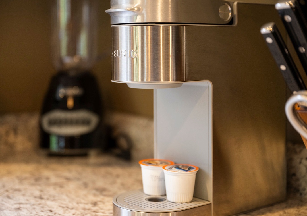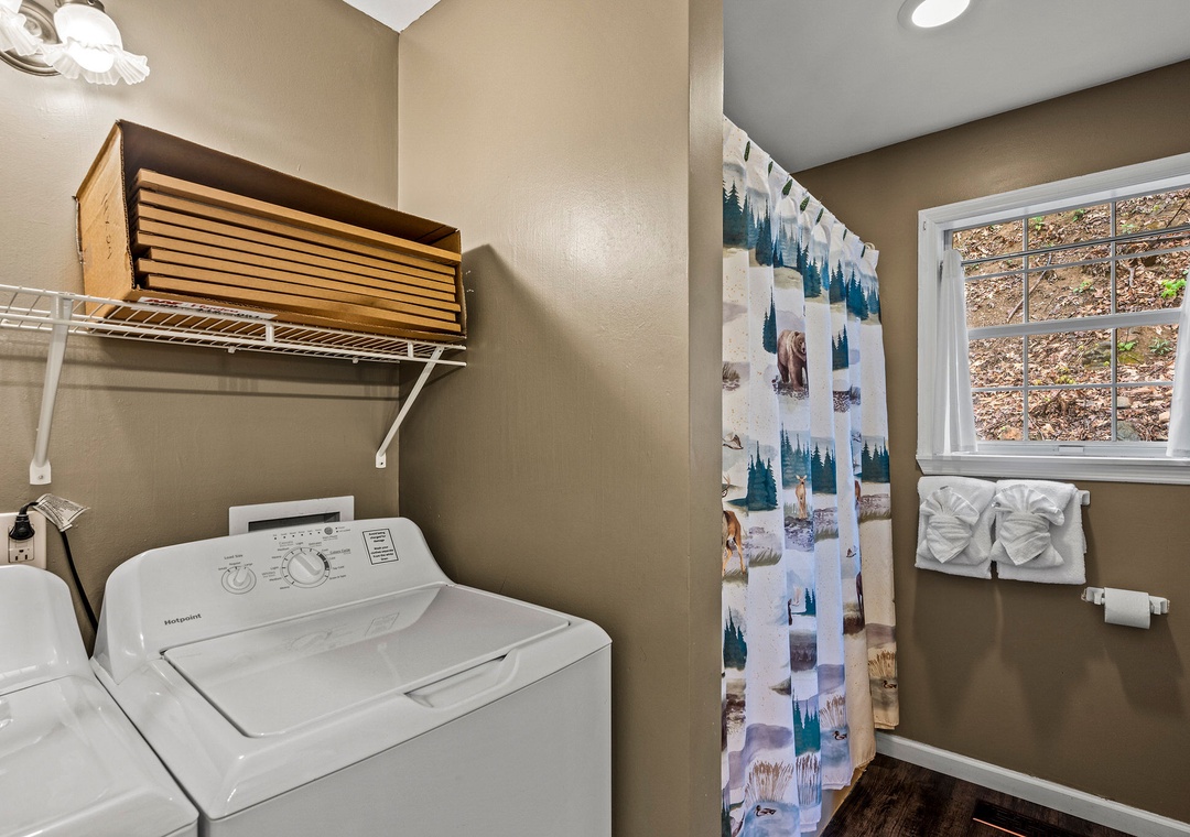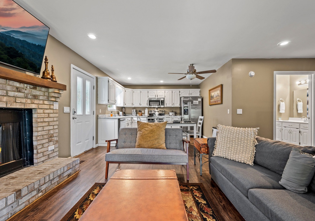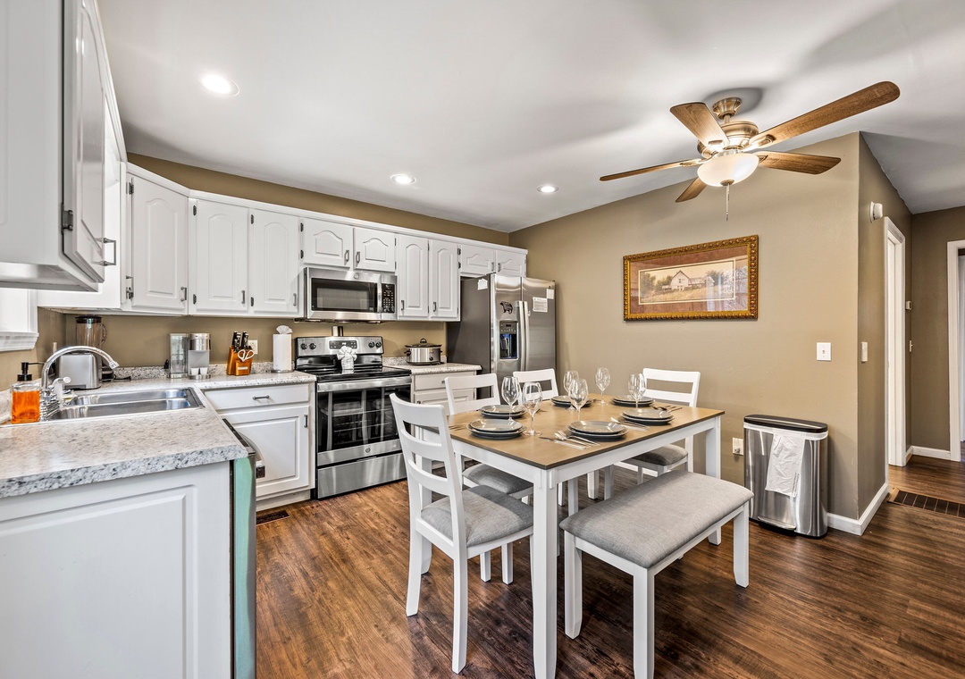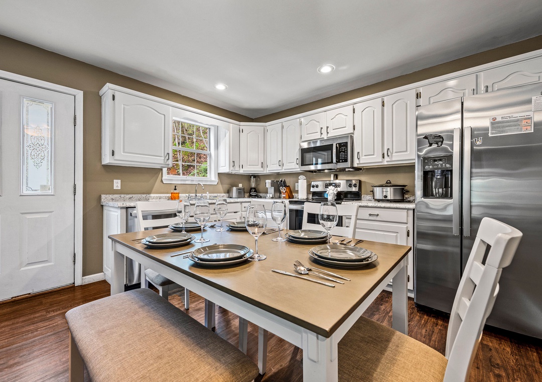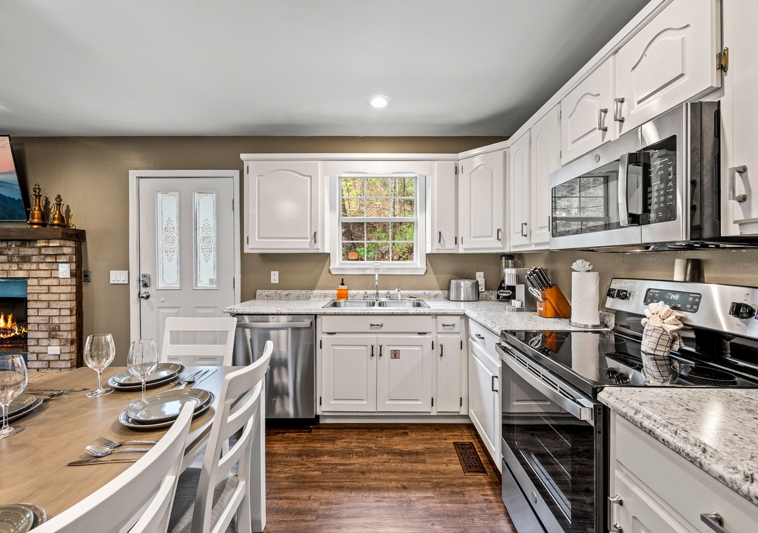The fully equipped kitchen is a culinary haven, ready to bring your favorite recipes to life. Complete with a full-sized refrigerator, dishwasher, stove, microwave, and other kitchen appliances perfect for making breakfast, lunch, or dinner throughout your stay! All pots, pans, glasses, plates, silverware, etc. are also there for you! Gather around the dine-in table, where laughter and stories flow as easily as the aromas from the kitchen. You can also extend your dining experience beyond the cabin's walls and step onto the outdoor seating and dining area for a delightful alfresco setting.