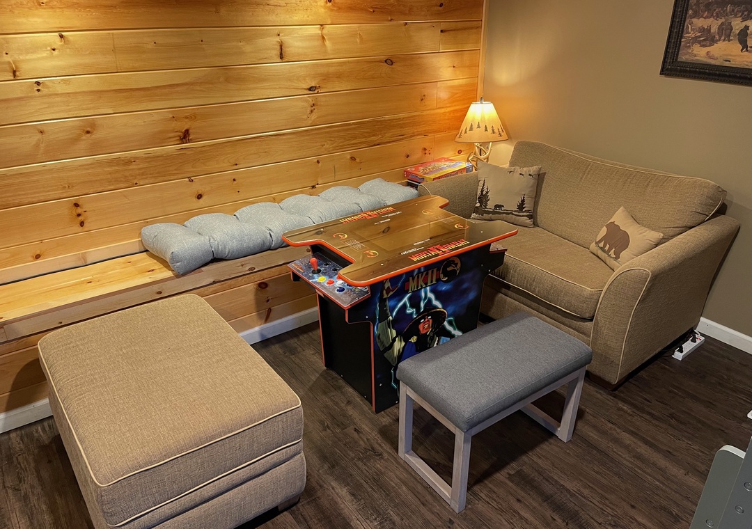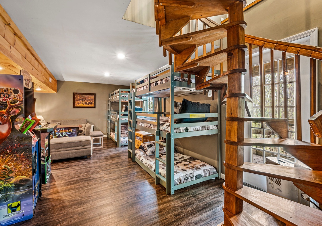 Step inside, and you'll find a cozy living area adorned with plush furnishings that invite you to unwind after a day of exploration. As the day winds down, retreat to the cozy bedrooms, each offering its unique charm. Cozy beds and tasteful decor ensure a peaceful night's sleep, so you wake up refreshed and ready for a new day of adventures. Downstairs, find two triple bunk beds (6 twin beds total), seating, and arcade games, adding an extra layer of excitement and friendly competition to your vacation. The fully equipped kitchen, complete with modern appliances, is ready to aid you with the cooking while the adjacent dining area is there to enjoy home-cooked meals with your family. Free WiFi is also available throughout the property.