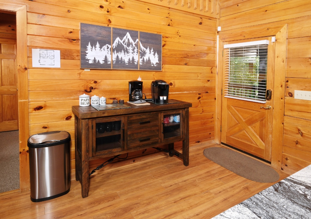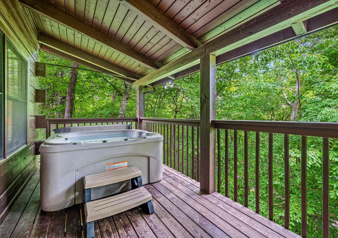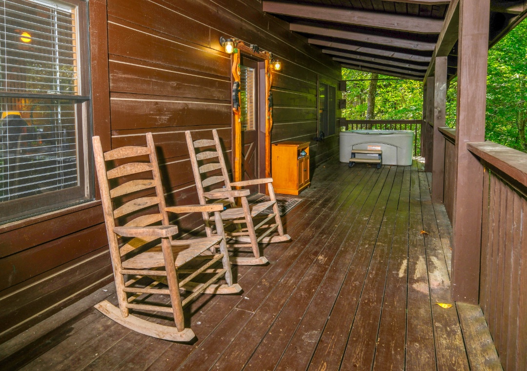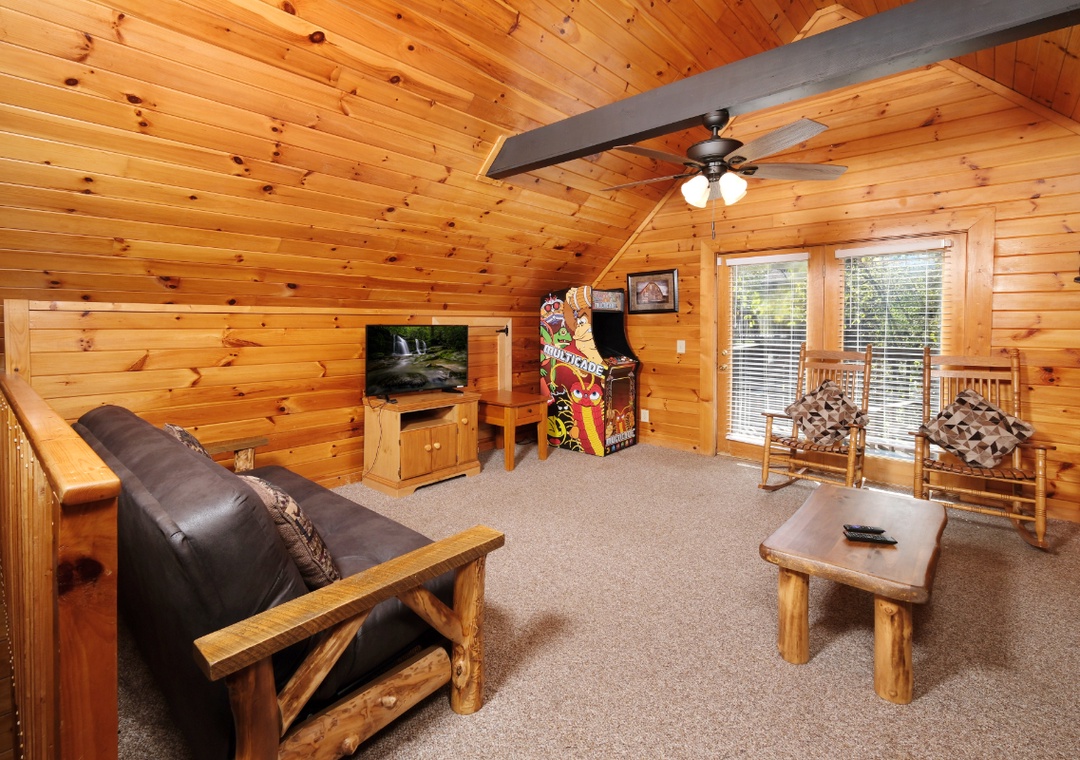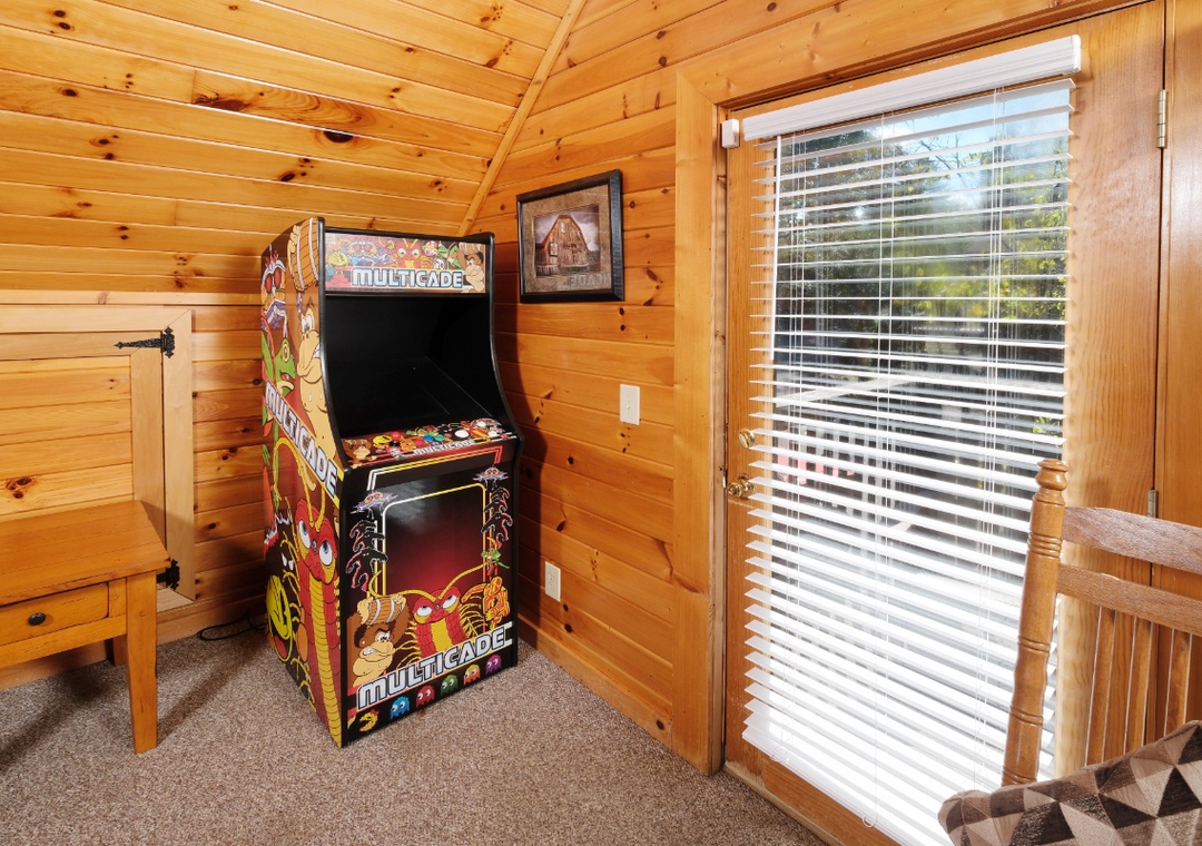The loft is where the fun really begins. Enjoy some competitive fun with the foosball table, multicade (arcade game), smart TV and more. And outside, when youre ready to kick off the day, the large porch is a great way to drink your morning coffee. Sit in the comfy wooden chairs or just lean on the railing and take in the scenic views. Of course the hot tub is a great way to relax after a long day of hiking (or shopping!) while enjoying a glass of wine or moonshine.