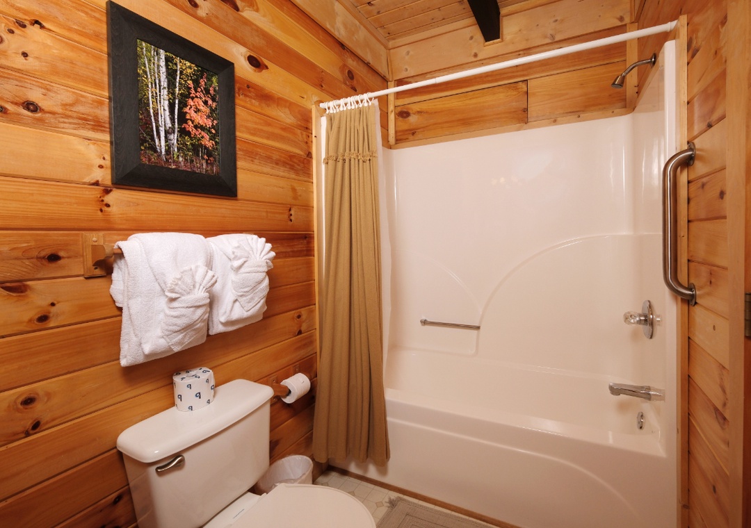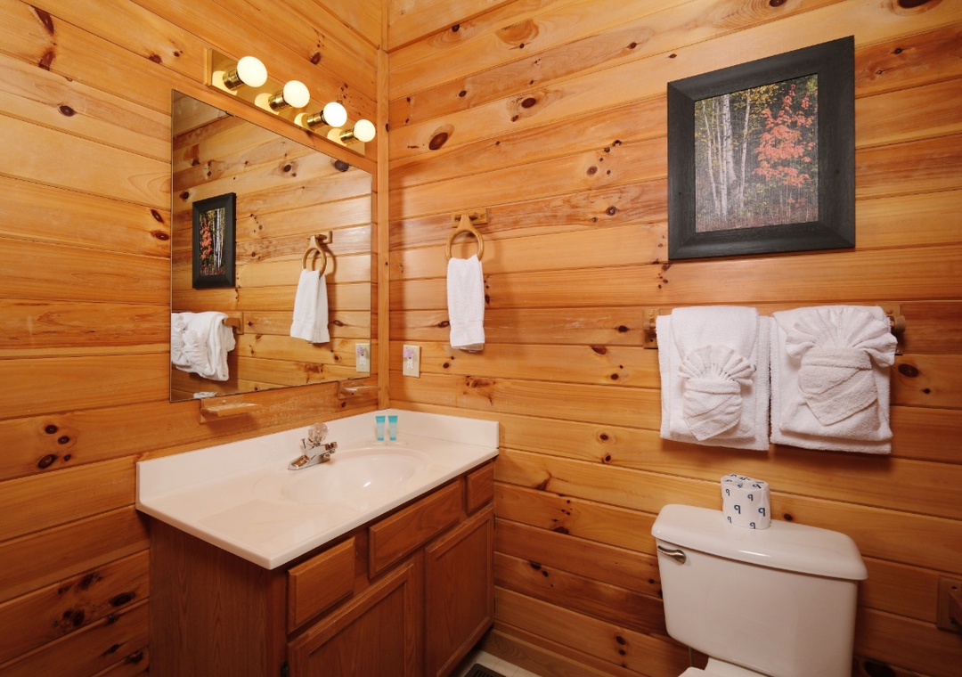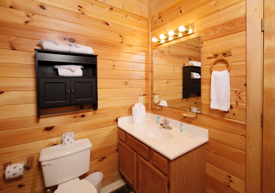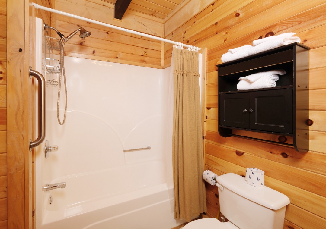 There are two bedrooms in the cabin (1 king and 1 queen), each with an adjoining bathroom. The loft area is wide open and has a sleeper sofa ; futon so you can spread out up there if you need to (or send the kids up there to play!). Each bedroom has an ensuite bathroom with sink, toilet and shower+tub, along with all the starter essentials youll need , such as towels, soap, shampoo and toilet paper.